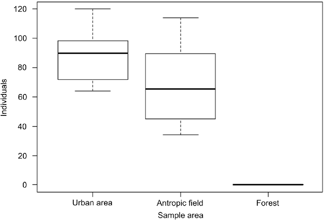 Figure 3. Variation in house sparrow, Passer domesticus, abundance between environments with different levels of urbanization. In Boxplot, the box is delimited by the 1st and 3rd quartiles, the median is represented by the horizontal line inside the box, and the extreme vertical lines represent the minimum and maximum values.