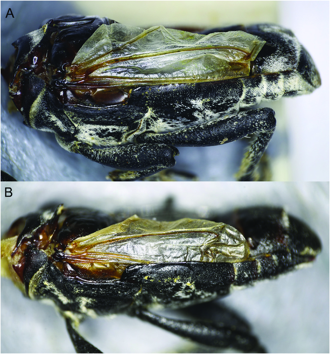 Fig. 6. Maximus strabus (Gyllenhal, 1834), wing, resting position (elytron removed): A — Aralık; B — Tuzluca.