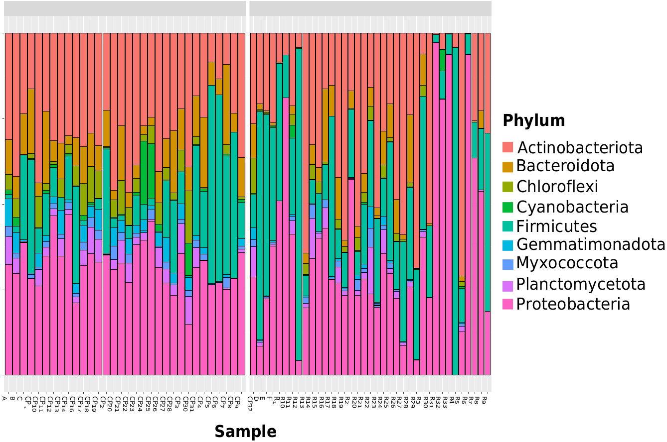 Fig. 4. Control and rhizosphere soil bacterial community relative abundances. The box plot depicts the abundance of phyla represented with over 1 % relative abundance in the control (left) and rhizosphere (right) samples.