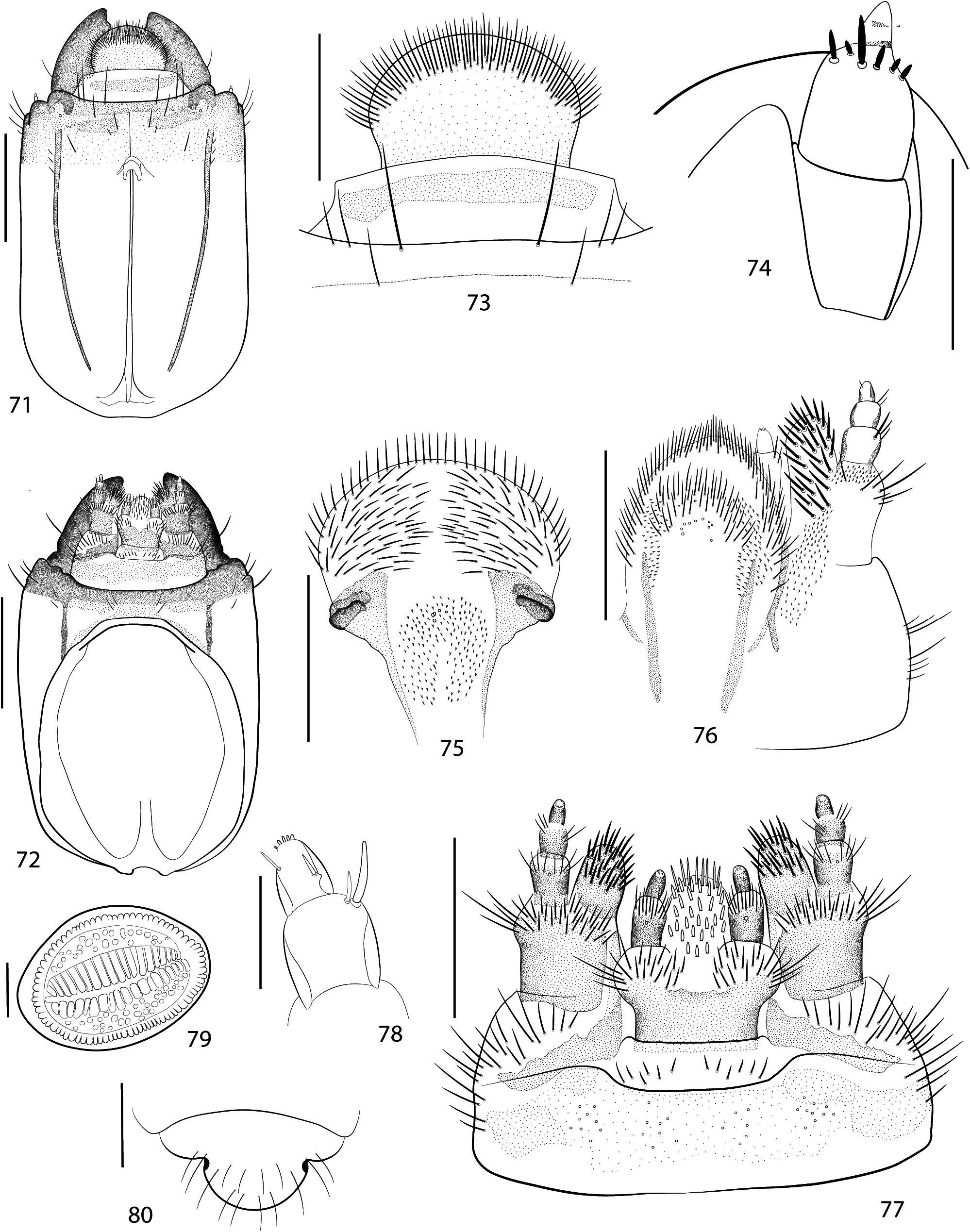 FIGURES 71–80. Xylergatoides asper (Bates, 1864). Larva. 71–72, head (dorsal, ventral); 73, clypeus and labrum; 74, antenna (dorsal); 75, epipharynx; 76, maxilla and labium (dorsal); 77, maxillae and labium (ventral); 78, maxillary palpus (dorsal); 79, thoracic spiracle; 80, abdominal apex (dorsal). Scale bars = 0.5 mm, except figs 71, 72, 80= 1.0 mm; 75, 78, 79 = 0.1 mm.