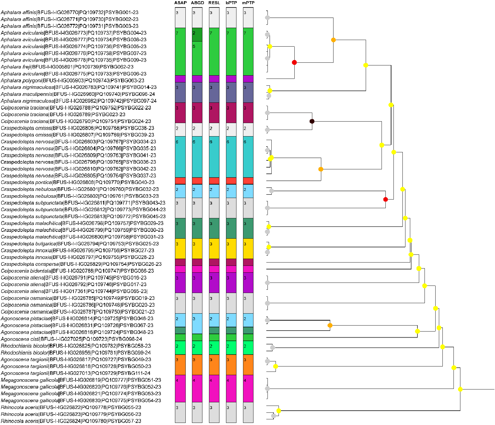 Figure 2. Results of species delimitation methods based on the cytochrome c oxidase subunit I (COI) gene. Each vertical colour bar represents different delimitation schemes obtained with ASAP, ABGD, RESL, bPTP, and mPTP methods, with the corresponding number of specimens. The tree is based on ASAP analysis, with nodes colour coded depending on their p-value (black: p <0.001, red: p <0.05, orange: p <0.1, yellow: p> 0.1, grey: not applicable).