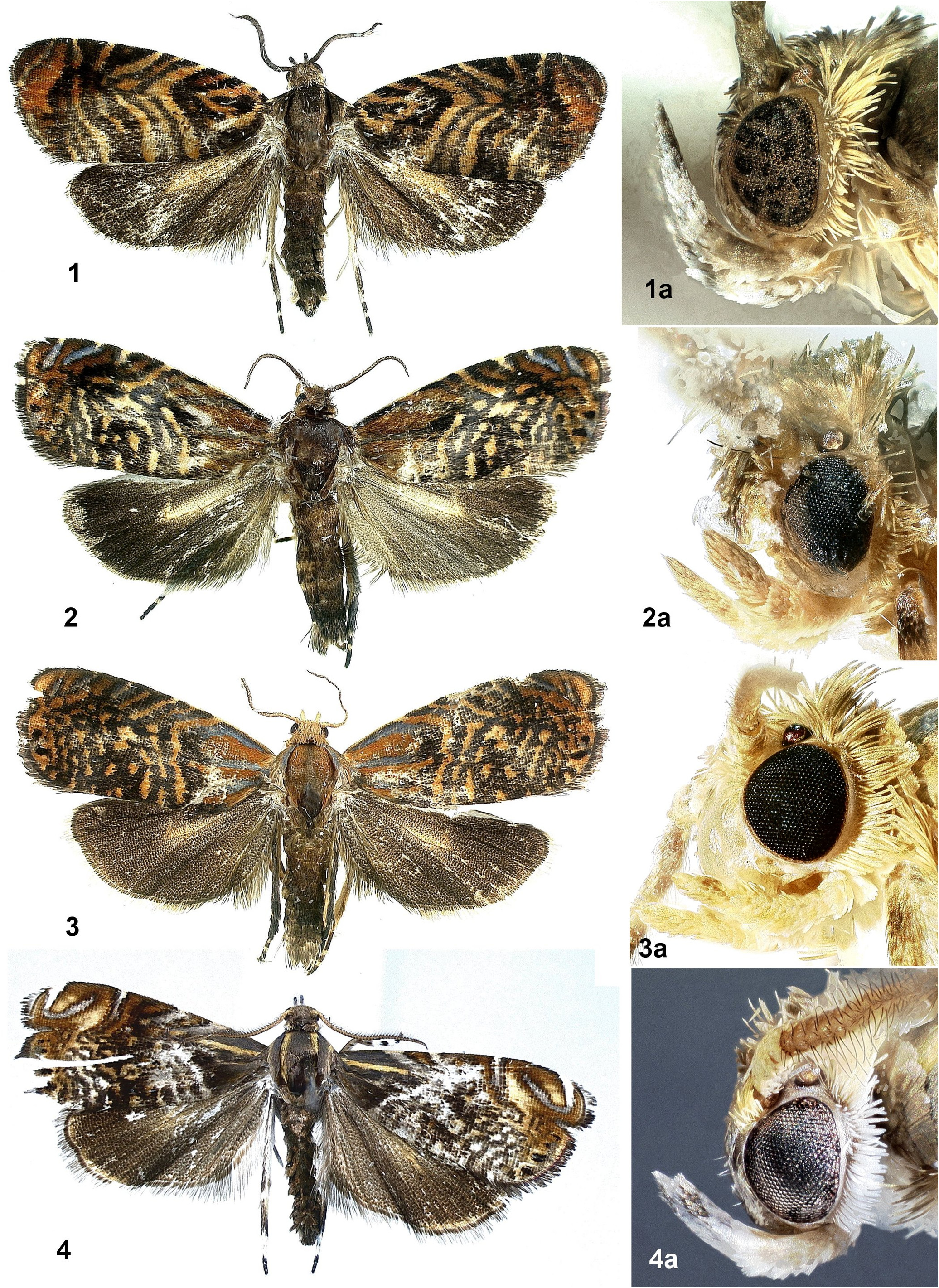 FIGURES 1–4. Adults of Vietnam Thaumatographa species (all holotype males), with lateral views of heads (a) for each moth: 1) T. cucphuongana sp. nov. (Cucphuong N. P., Ninh Binh Prov.) (photo 12691) (MGCL); 2) T. carapaceana sp. nov. (Cucphuong N. P., Ninh Binh Prov.) (photo 12689) (MGCL); 3) T. melinhana sp. nov. (Me Linh Biol. Sta., Vinh Phuc Prov.) (photo 12646); and 4) T. tamdaoana sp. nov. (Tam Dao, Vinh Phuc Prov.) (INUC/NIBR).