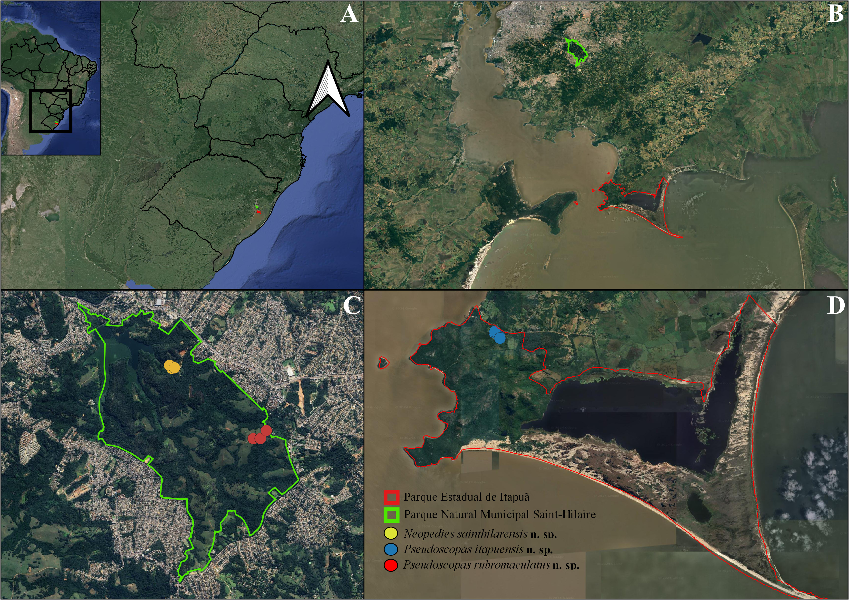 FIGURE 9. Map of geographical distribution of Pseudoscopas and Neopedies new species. (A) Map of Brazil with emphasis on the southern region of Brazil. (B) Sampling point in green and red; (C) Limits of the Parque Natural Municipal Saint'Hilaire in green, with sampling points collection of Neopedies sainthilarensis sp. nov. and Pseudoscopas rubromaculatus sp. nov. (D) Limites of Parque Estadual de Itapuã in red, with sampling points collection of Pseudoscopas itapuensis sp. nov..
