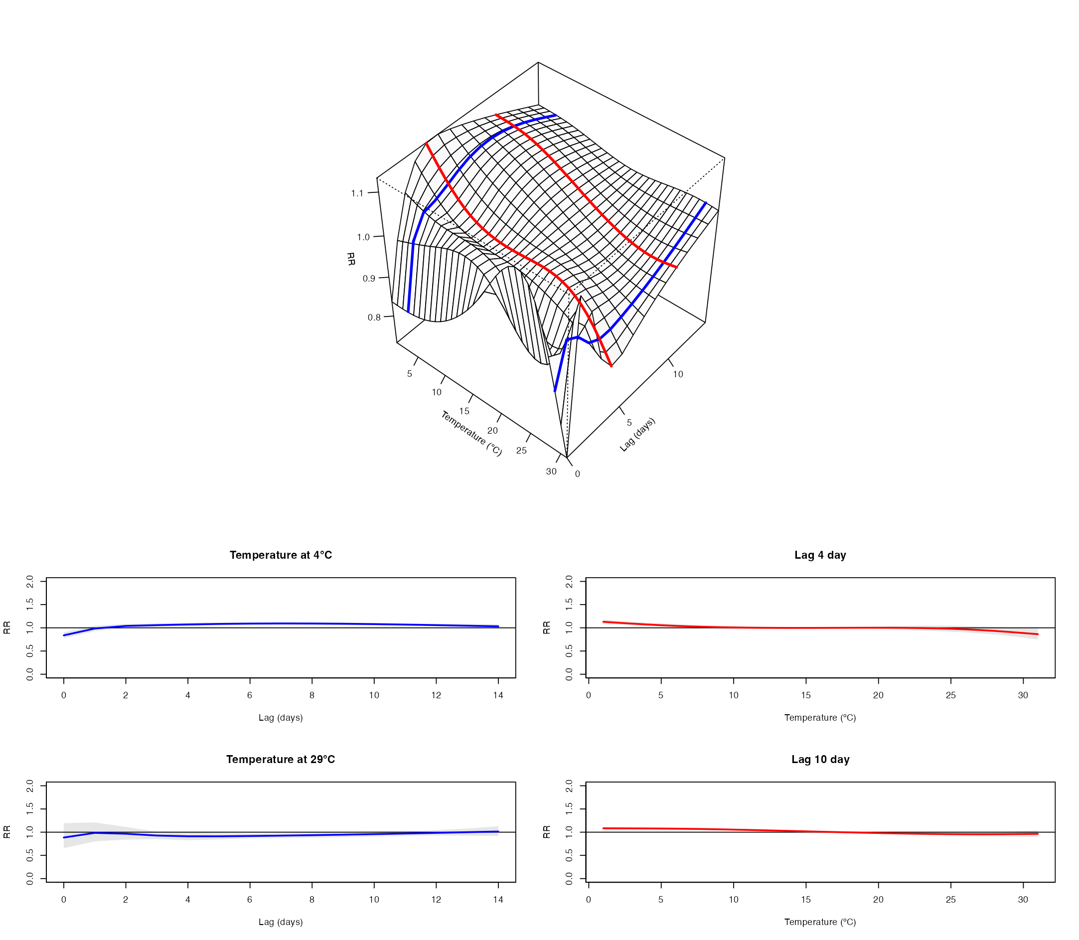 Data file 2. Association between daily mean temperature and influenza incidence in Kawasaki City, Japan. The top panel shows the RR of total influenza case counts across daily mean temperature and lag dimensions, with 17.3 °C (MMT) as the reference. The bottom-left panel illustrates the RR at cold and hot temperatures (5 °C and 29 °C, respectively) at specific lag days, while the bottom-right panel shows the RR at lag days 4 and 10 across the temperature distribution. Abbreviations: RR, relative risk; MMT, minimum morbidity temperature.