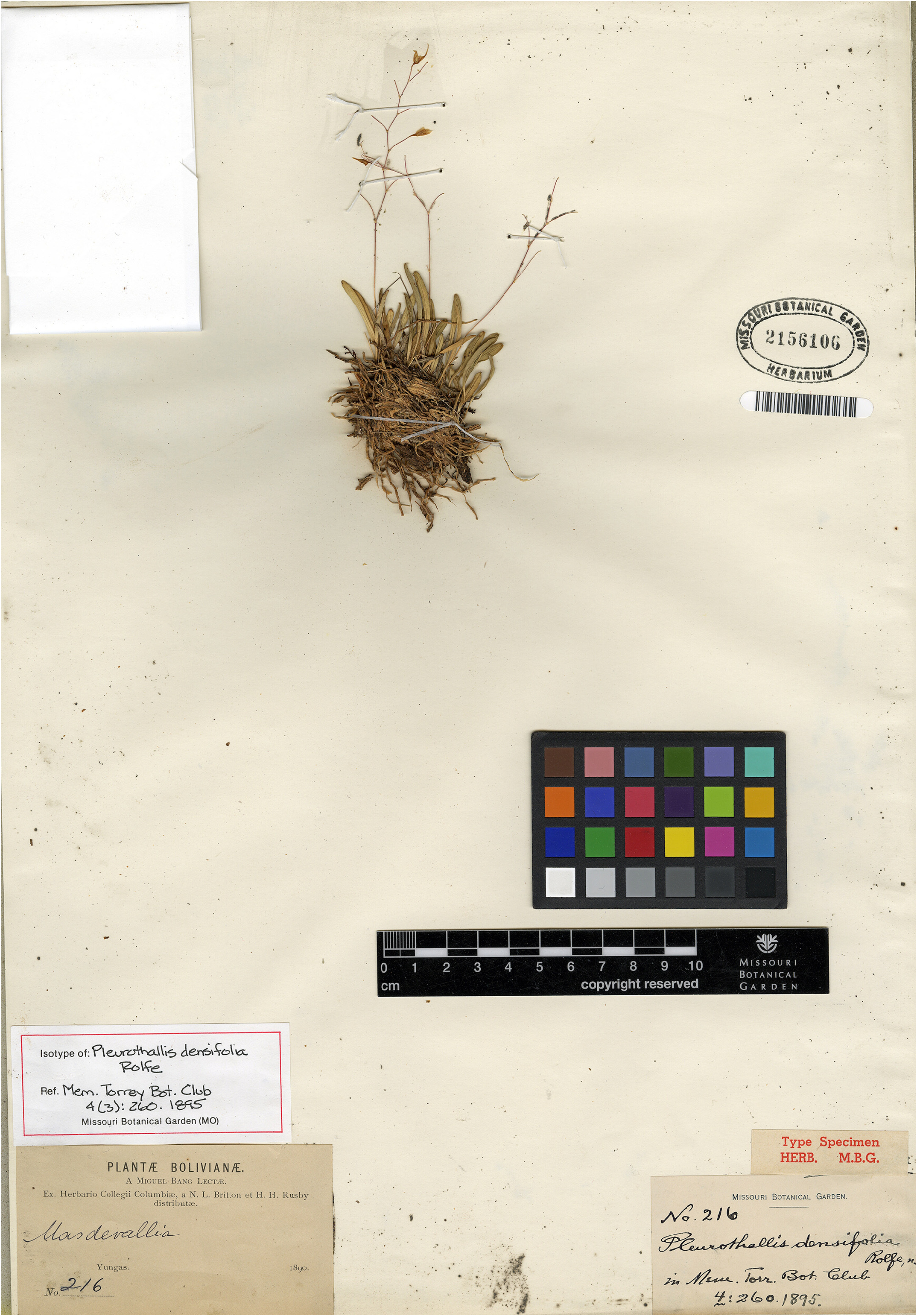 FIGURE 10. Isolectotype of Pleurothallis densifolia Rolfe, M. Bang 216 (MO-1183156). Reproduction with permission of Missouri Botanical Garden.