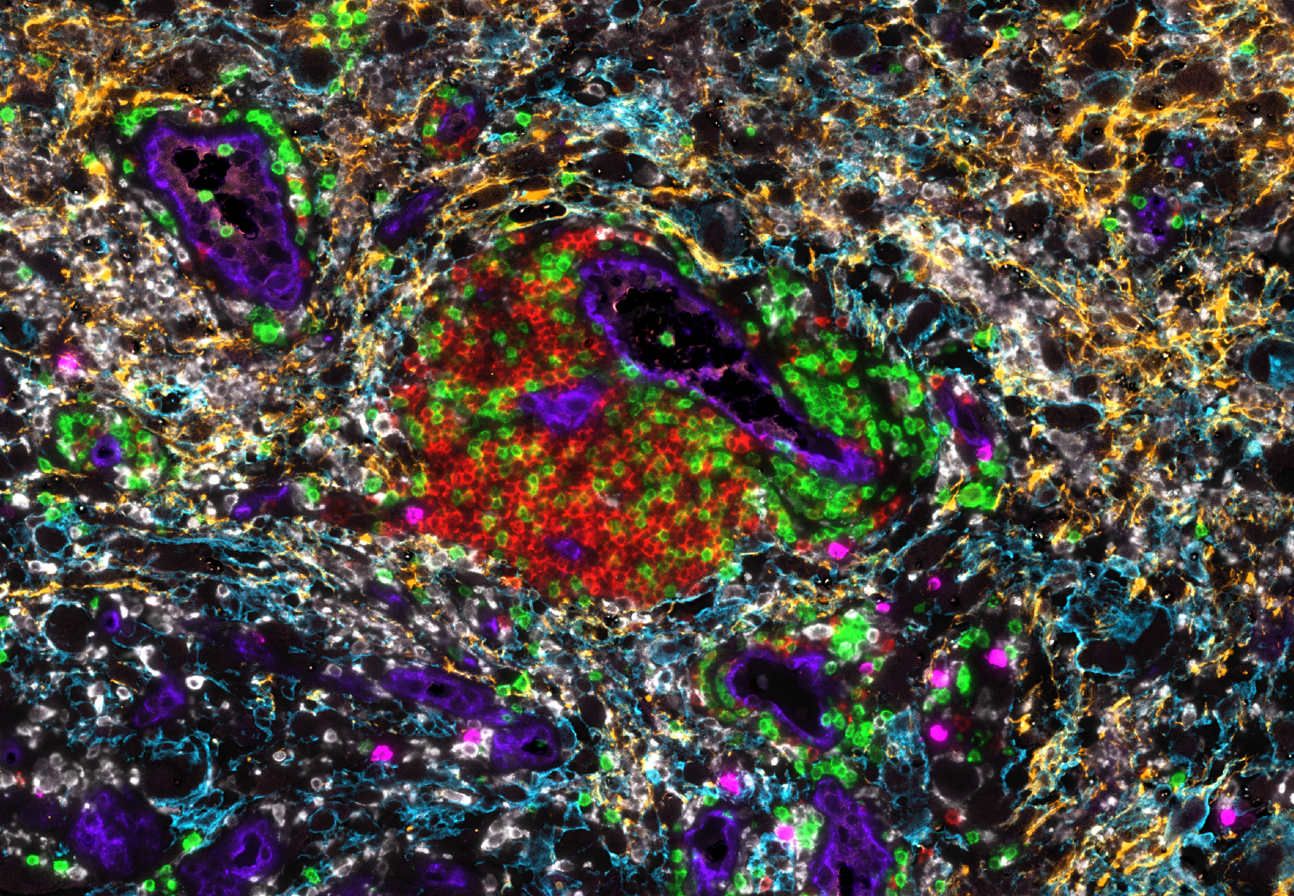 The image shows a perivascular accumulation of B cells, T cells and plasma cells in a human brain tumor. These structures, also known as tertiary lymphoid structures, are sites of lymphocyte clonal expansion and plasma cell formation. The study aims to determine the clinical relevance and immunological function of tertiary lymphoid structures in human primary brain tumors.