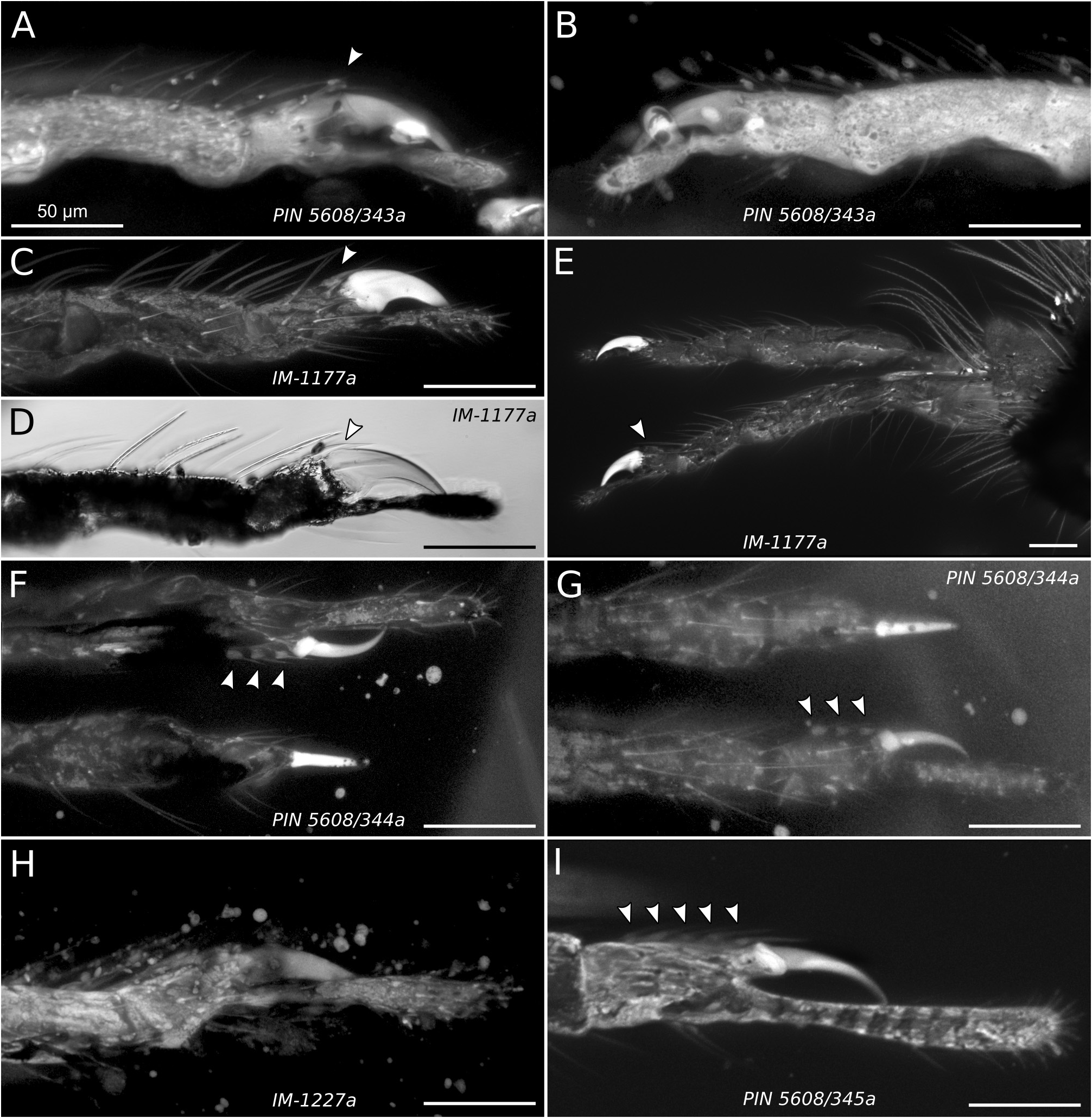 FIGURE 18. Morphology of palps in Punkochyzeria gen. nov. A, B—P. minaevi sp. nov., holotype, PIN 5608/343a, lateral aspect; C–E—P. minaevi sp. nov., paratype, IM-1177a, lateral aspect. Note the structure near the claw (odontus) which can be interpreted as undeveloped accessory claw, or paradont (arrow); F—P. makolae sp. nov., holotype, PIN 5608/344a, ventral aspect; right palp is rotated and viewed as if in lateral aspect; arrow points to a row of three setae, which can be interpreted as ctenidia; G—the same, dorsal aspect; H—Punkochyzeria sp., specimen IM-1227, right lateral aspect; I—the same, left lateral aspect; J—the same, ventral aspect. All except E to same scale. All except D—CLSM; D—transmitted light, DIC.