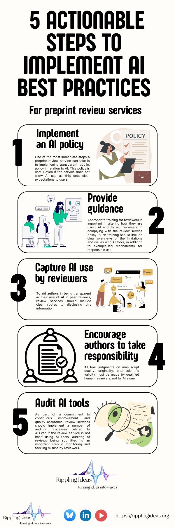 Adopting these best practices will help peer review services and potentially traditional journals in ensuring safe, fair, and transparent use of AI in scientific publishing, safeguarding integrity and supporting community trust.