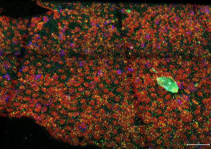 3D confocal images of dorsal views of dissected telencephala from 4 months post-fertilization (mpf) zebrafish. Dataset of images to complement the paper: FishFeats: streamlined quantification of multimodal labeling at the single-cell level in 3D tissues Bit depth for all the images acquired was 16 bit, a tile scan of multiple Z stacks all with a voxel size of 0.207 µ m by 0.207 µ m by 0.5 µ m. Immunohistochemistry (IHC) for Zo1 (Zonula occludens 1) outlines the apical cell contours, and IHC of Sox2 is used for the identification of neural stem cells and progenitor cells corresponding mostly to the first layer of cells. Expression of pcna, her4 and hey1 (in green, orange and red) were detected using for fluorescent in situ hybridization (FISH)