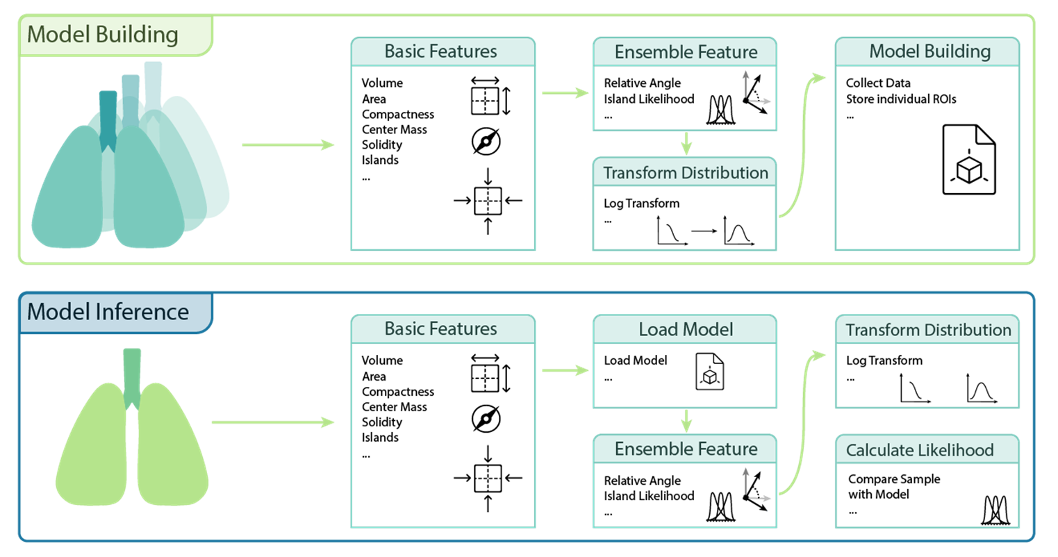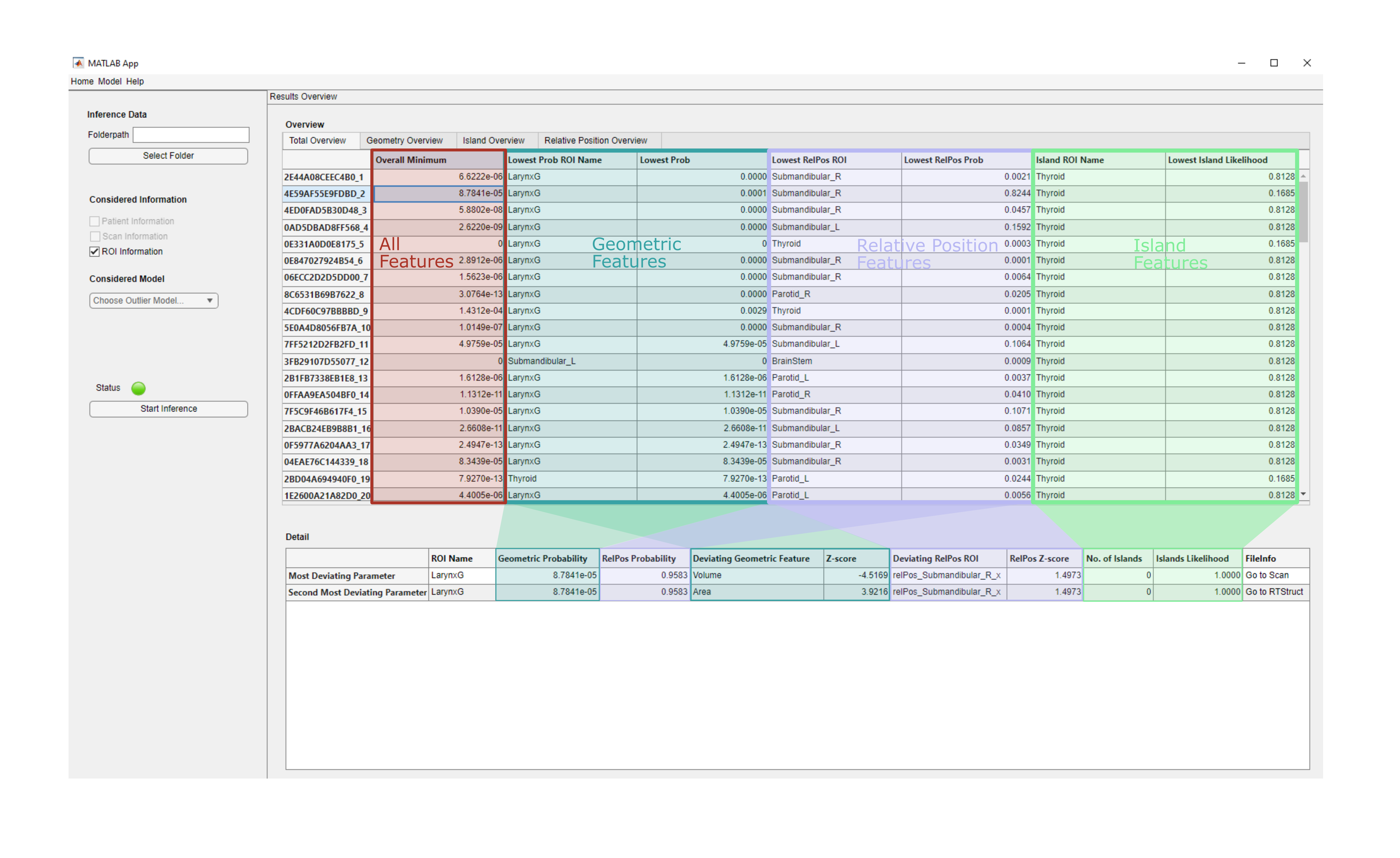 The ODT characterises ROIs by their geometric properties, relative positions and islands and creates a reference model based on principal component analysis (see Fig.1). For each ROI, the tool returns a value between 0 and 1, with values close to 0 indicating an outlier. A prostate cancer dataset consisting of 25 manually delineated clinical scans from 25 patients was used for training, and 1288 AI-delineated scans from 116 patients were used to evaluate the performance.
