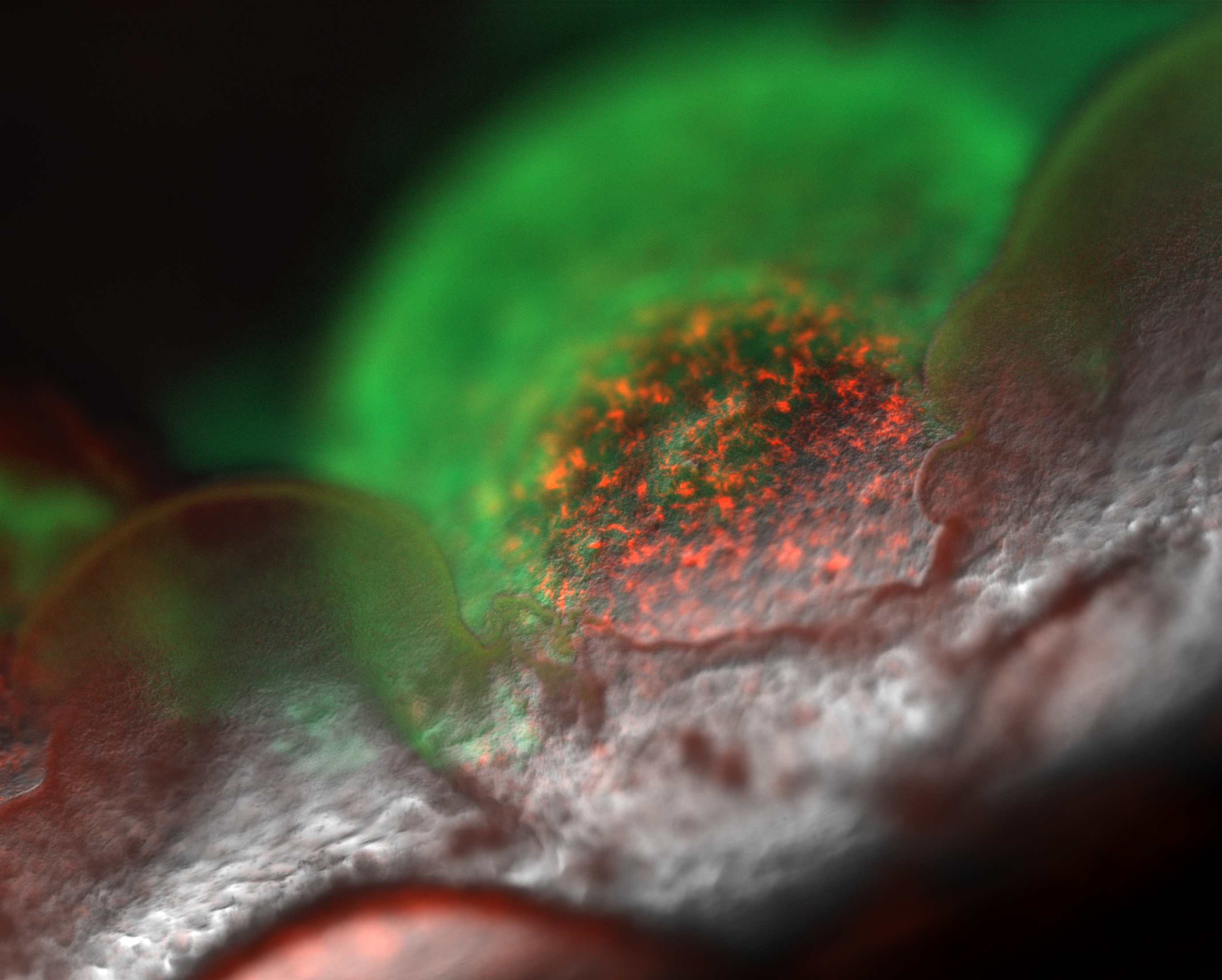 The image shows 125x magnified microscopic details of a biofilm formed by Pseudomonas fluorescence on the surface of a liquid culture medium. The culture was inoculated with a cellulose-overexpressing and surface-colonizing mScarlet-tagged wild type and a GFP-tagged mutant that is unable to colonize the surface. The biofilm can collapse over time due to its own mass, so that new strategies have to be developed and thus a life cycle emerges.