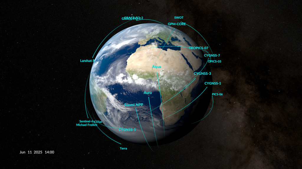 Visualizations depicting a near-real-time view of NASA fleet of Earth-orbiting satellites.