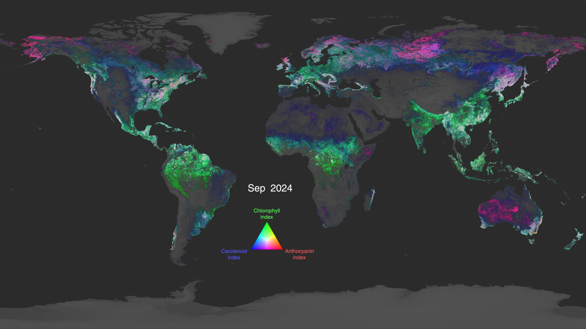 Global view of three major classes of plant pigments observed by the PACE satellite: chlorophylls, carotenoids, and anthocyanins.