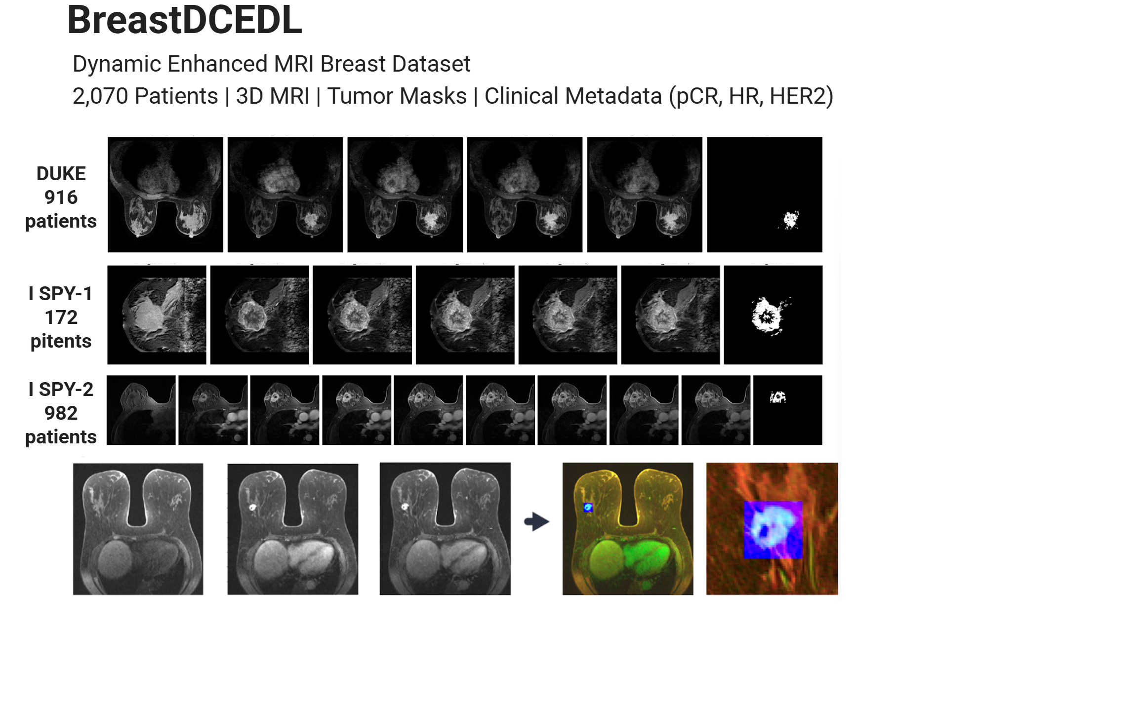 BreastDCEDL is a curated, deep learning–ready dataset of 3D DCE-MRI scans from 2,070 breast cancer patients across three major clinical trials (I-SPY1, I-SPY2, Duke) available through The Cancer Imaging Archive (TCIA). The dataset includes pre-treatment MRI volumes, 3D tumor segmentations, and harmonized clinical and demographic metadata, including pathologic complete response (pCR), hormone receptor (HR), and HER2 status. This resource supports advanced AI research in breast cancer, enabling training and evaluation of transformer-based and other deep learning models.