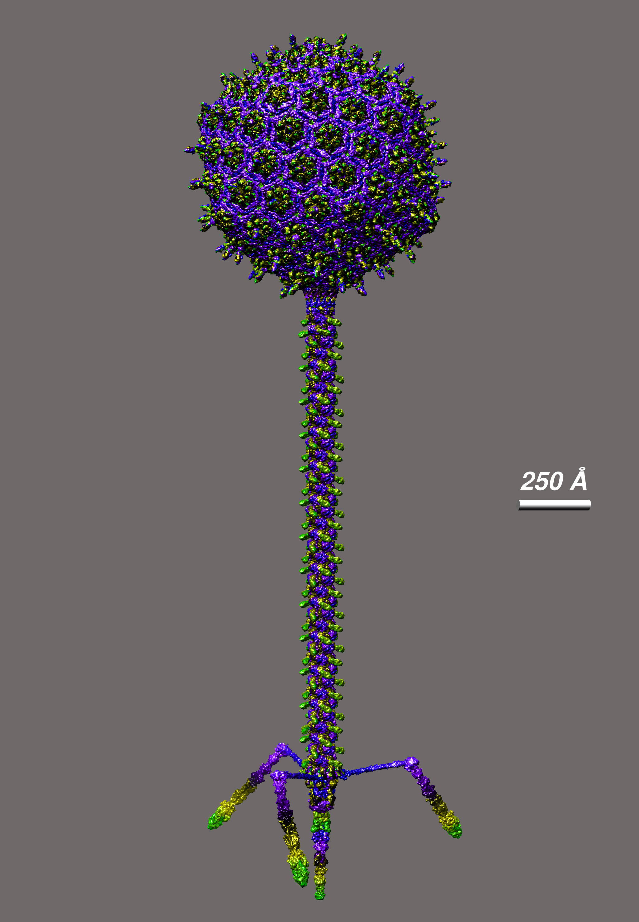 Bacteriophage T5 structure at atomic resolution. This structure has been constructed in UCSF Chimera software putting together all the structures that compose bacteriophage T5 using cryoEM reconstructions and pdb structures updated to October 2025. By Dr. Victor Padilla-Sanchez, PhD from Washington Metropolitan University. Email: drvictorpadilla@aol.com