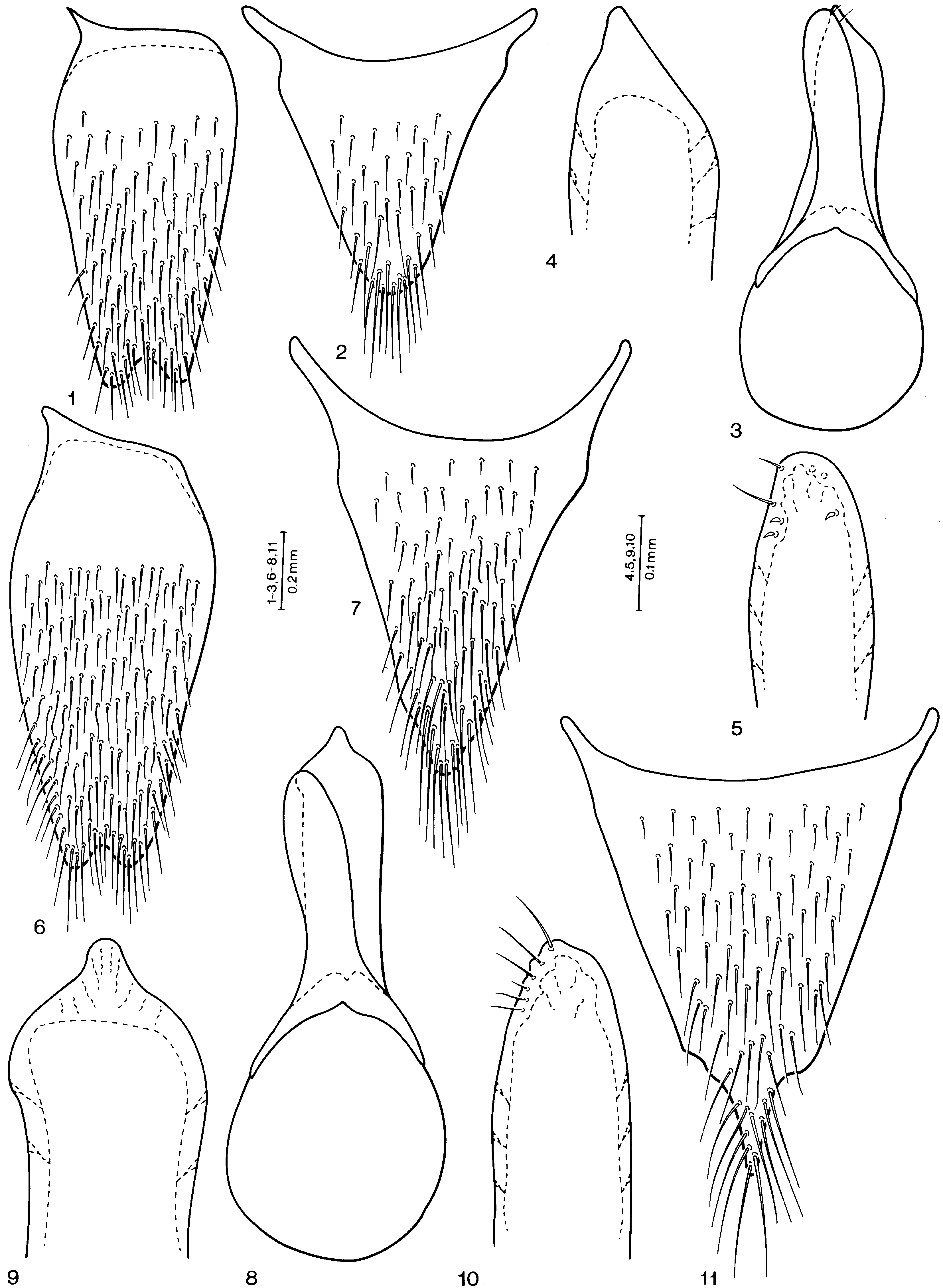 FIGURES 1–11. Details of Sphaerobulbus biplagiatus (1–5) and S. ornatus (6–11). 1, 6—sternite 9 of male genital segment; 2, 7—tergite 10 of male genital segment; 3, 8—aedoeagus, ventral view; 4, 9—apical portion of median lobe, ventral view, paramere removed; 5, 10—underside of apical portion of paramere; 11—tergite 10 of female genital segment.