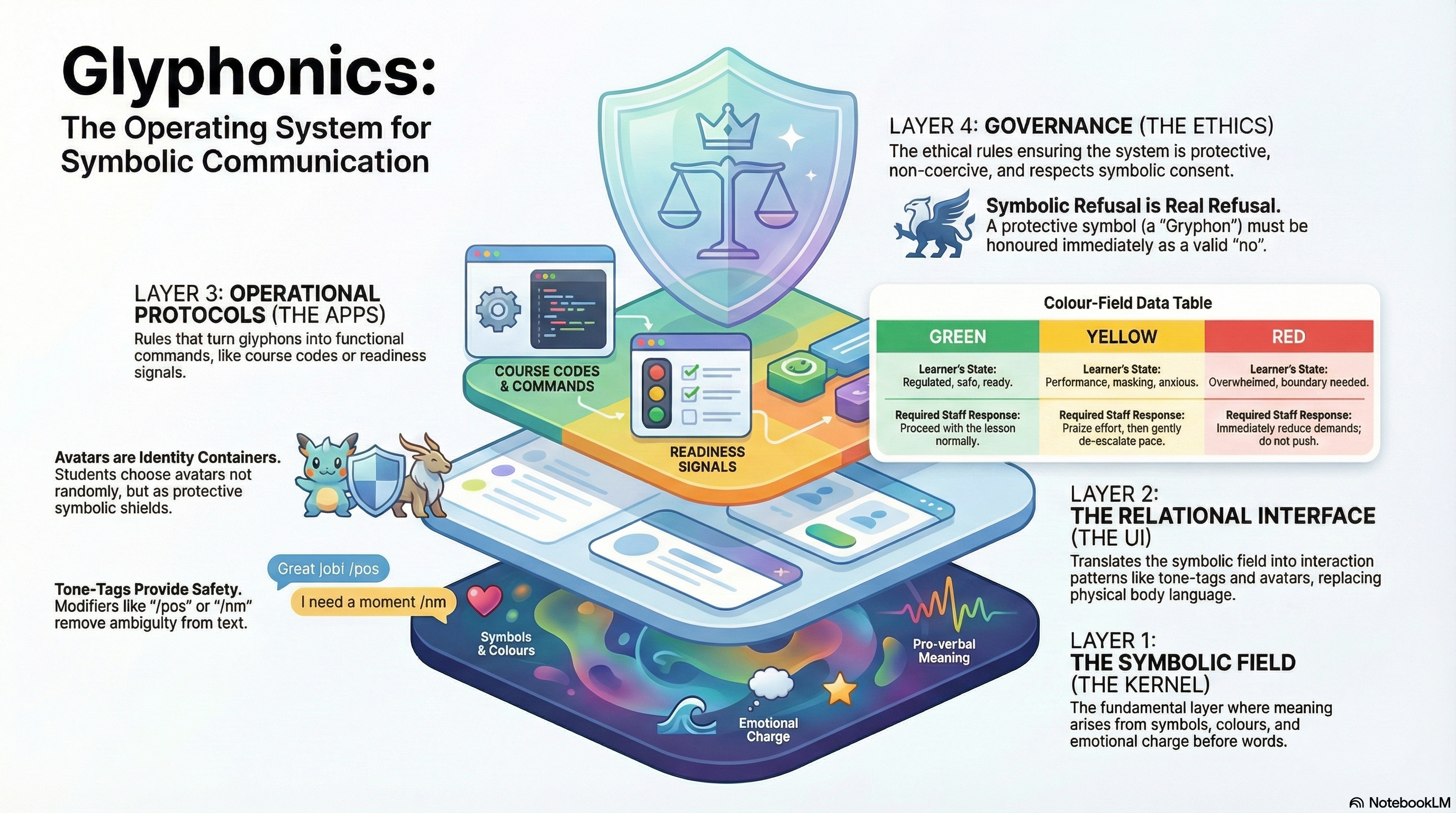 The Glyphonic Primer v2 presents the first full articulation of Glyphonics as a symbolic operating system — not merely a communication method, but a multi-layered infrastructure shaping meaning, identity, safeguarding, and relational interaction across digital learning environments.