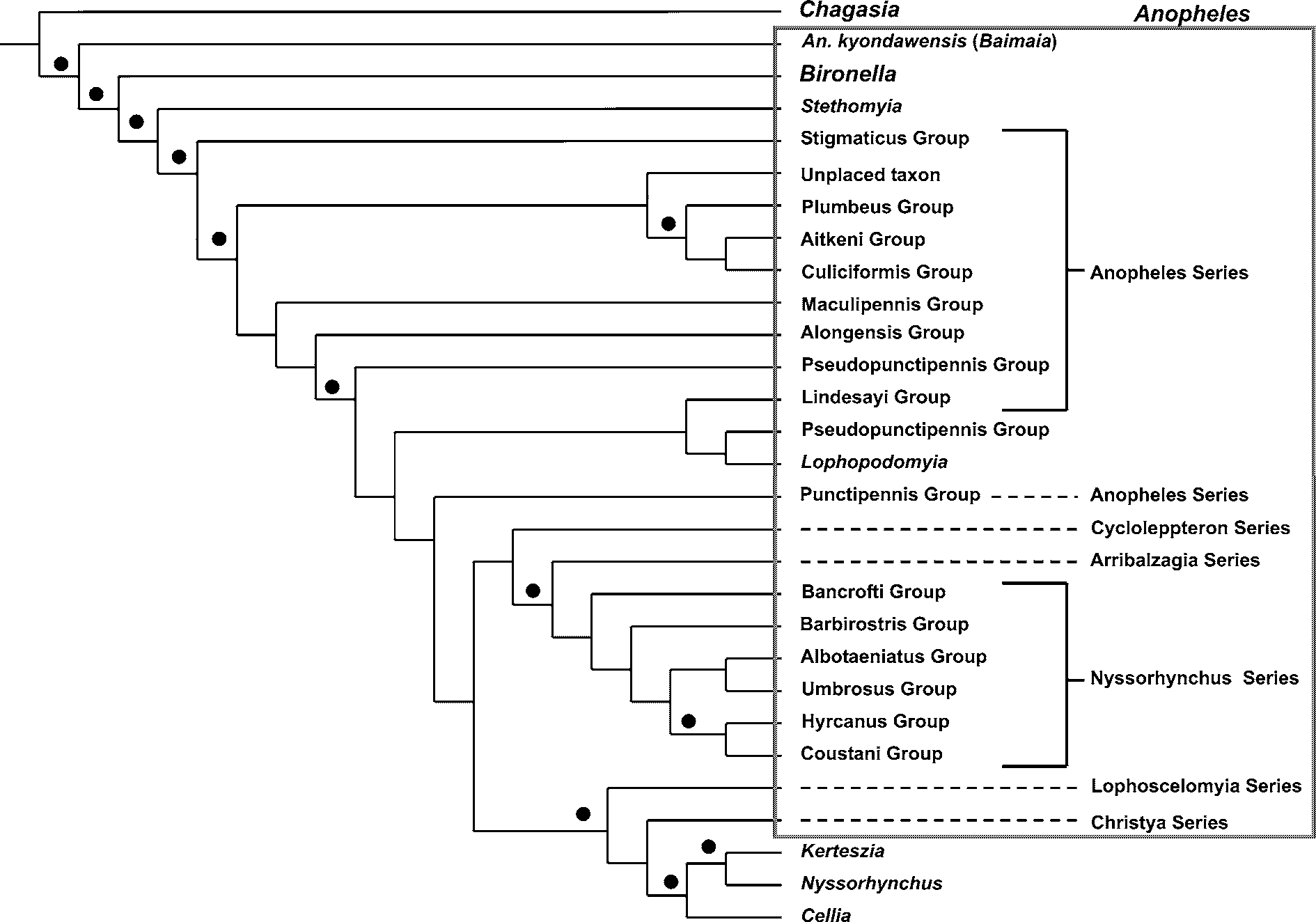 FIGURE 10. Phylogeny of Anophelinae based on morphology (modified from Harbach & Kitching, 2005): strict consensus tree from implied weighting analysis (K=1) of 66 anopheline species and 167 anatomical characters. Filled circles indicate Bremer support values greater than 0.8.