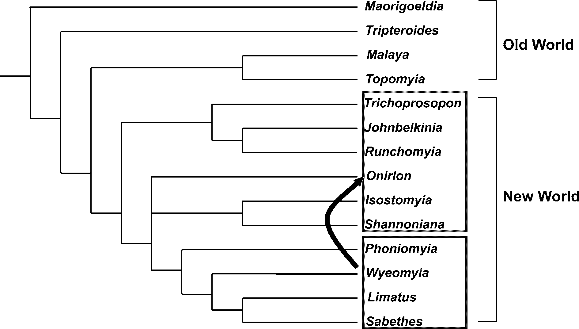 FIGURE 27. Phylogeny of Sabethini based on morphology (after Harbach & Peyton, 2000): relationships of sabethine genera when Onirion is included to the data set of Harbach & Kitching (1998) (cf. Fig. 26).