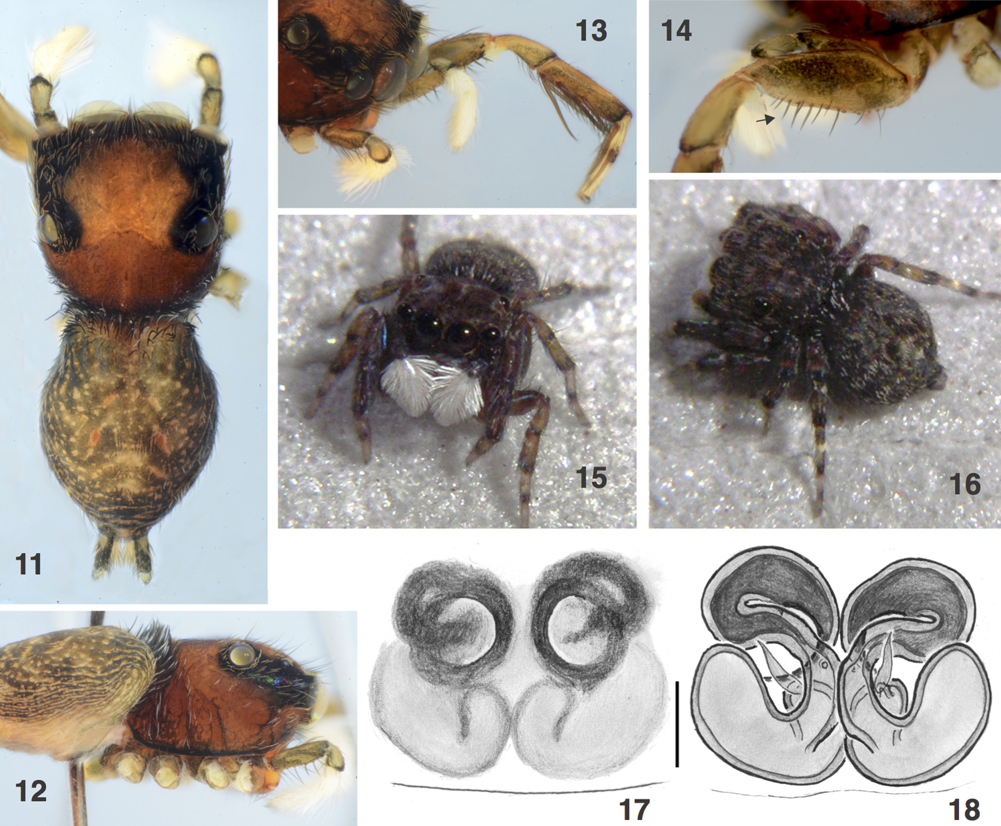FIGURES 11–18. Papuaneon tualapa sp. nov., female paratype (specimen 2008PNG-0845). 11 female paratype, dorsal view of carapace and abdomen; 12 lateral view; 13 oblique view of face and first leg; 14 retrolateral view of first leg femur (arrow highlights row of macrosetae); 15–16 living female; 17 ventral view of epigynum (scale bar 0.1 mm); 18 dorsal view of epigynum, cleared with clove oil. Figs 11–18 are copyright © 2016 W. P. Maddison, released under a Creative Commons Attribution (CC-BY) 3.0 license.