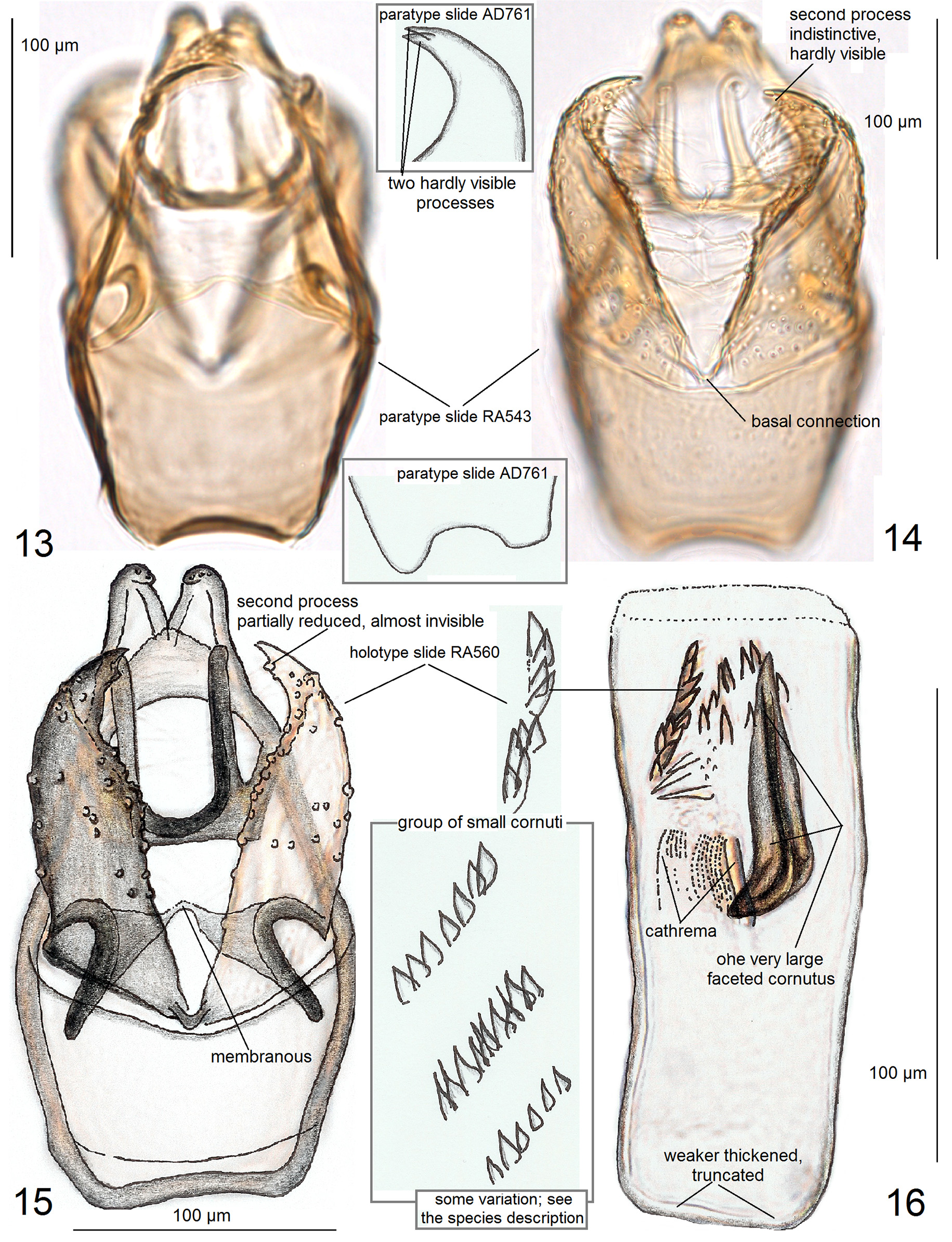 FIGURES 13–16. Male genitalia of Stigmella olekarsholti Remeikis, Diškus & Stonis, sp. nov. 13, 14, paratype, capsule with phallus removed, genitalia slide no. RA543; 15, holotype, capsule, genitalia slide no. RA560; 16, same, phallus (ZMUC).