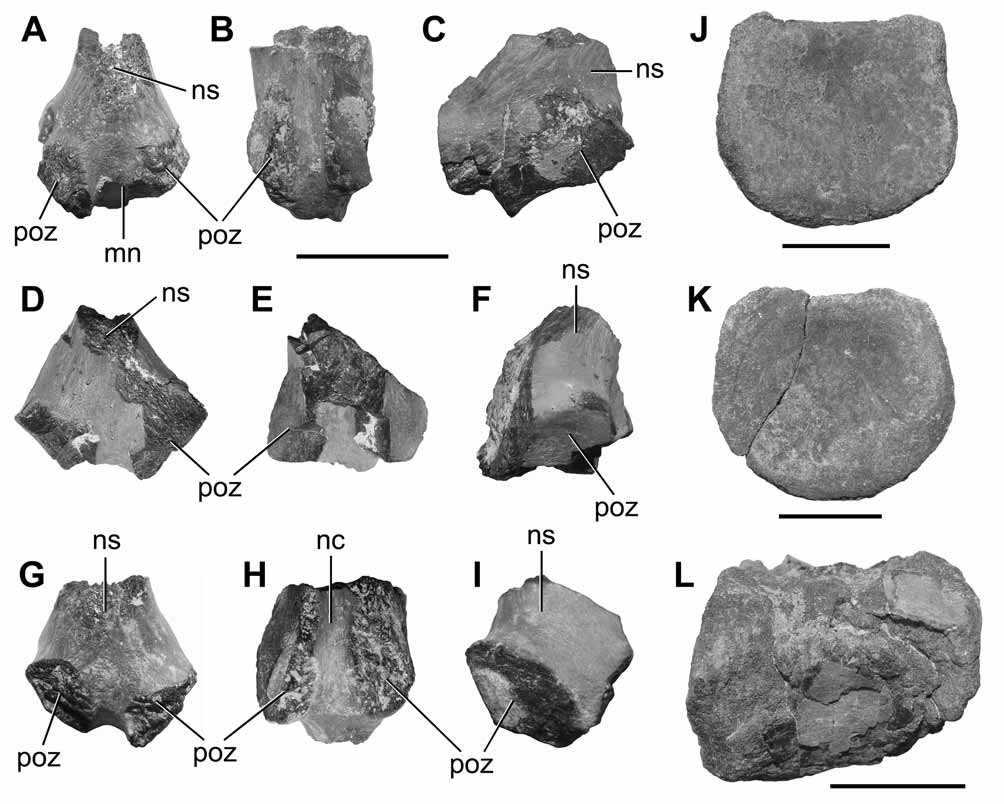 FIGURE 6. Caudal vertebrae of Austrocheirus isasii. Neural arches in posterior (A, D, G), ventral (B, E, H), left lateral (C, F), and right lateral (I) views. Centra in anterior/posterior (J, K) and side (L) views. Abbreviations: mn, median notch; nc, neural canal; ns, neural spine; poz, postzygapophysis. Scale bars equal 2 cm.