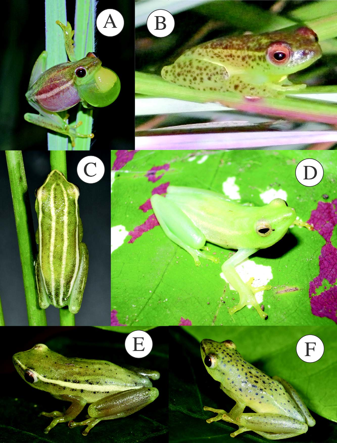 FIGURE 4. Hyperolius acuticeps Chongoni, Malawi, photo V. Mercurio (A); H. adspersus Bateka Nature Reserve, Gabon, photo G. Jongsma (B); H. benguellensis, Humpata, Angola, photo A. Channing (C); H. friedemanni sp. nov., Karonga, Malawi, photo V. Mercurio (D); H. howelli sp. nov. holotype, SAIAB 118979, Arusha, Tanzania, photo A. Channing (E); H. howelli sp. nov. female paratype, SAIAB 118980-1, Arusha, Tanzania, photo A. Channing (F).
