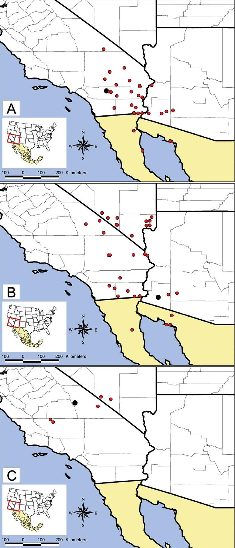 FIGURE 11. Geographic distribution of: (A) Pogonomyrmex magnacanthus Cole, (B) Pogonomyrmex hoelldobleri Johnson, Overson & Moreau, and (C) Pogonomyrmex mohavensis Johnson; the larger filled black circle in each panel denotes the type locality. All three maps are drawn on the same geographic area so that distribution patterns are directly comparable.