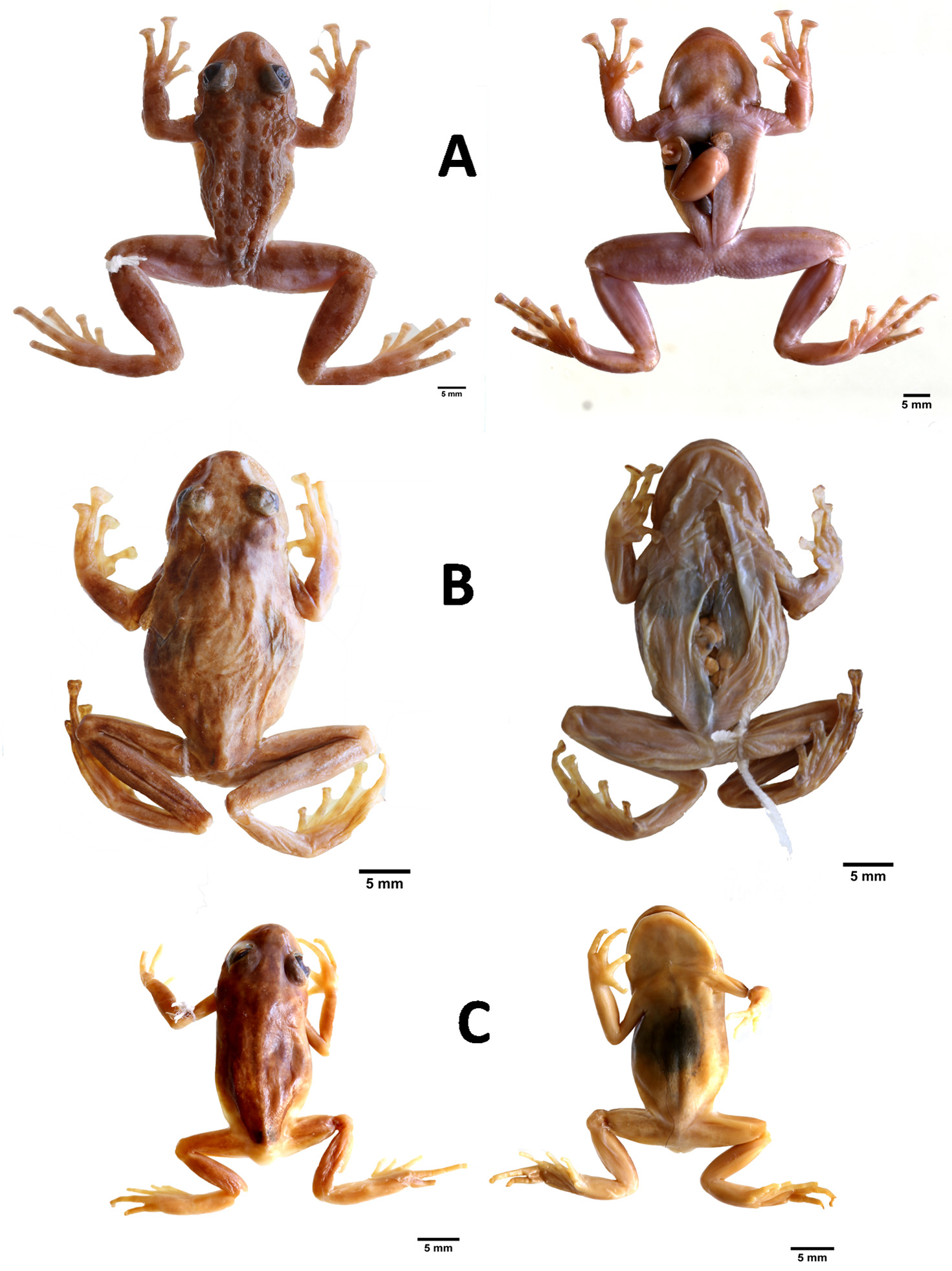 FIGURE 6. Family Heleophrynidae and Hyperoliidae: A—Holotype of Heleophryne hewitti (PEM A11156), B—Lectotype of Heleophryne rosei (PEM A1541), C—Holotype of Kassina wealii quinque-vittata (PEM A6289).