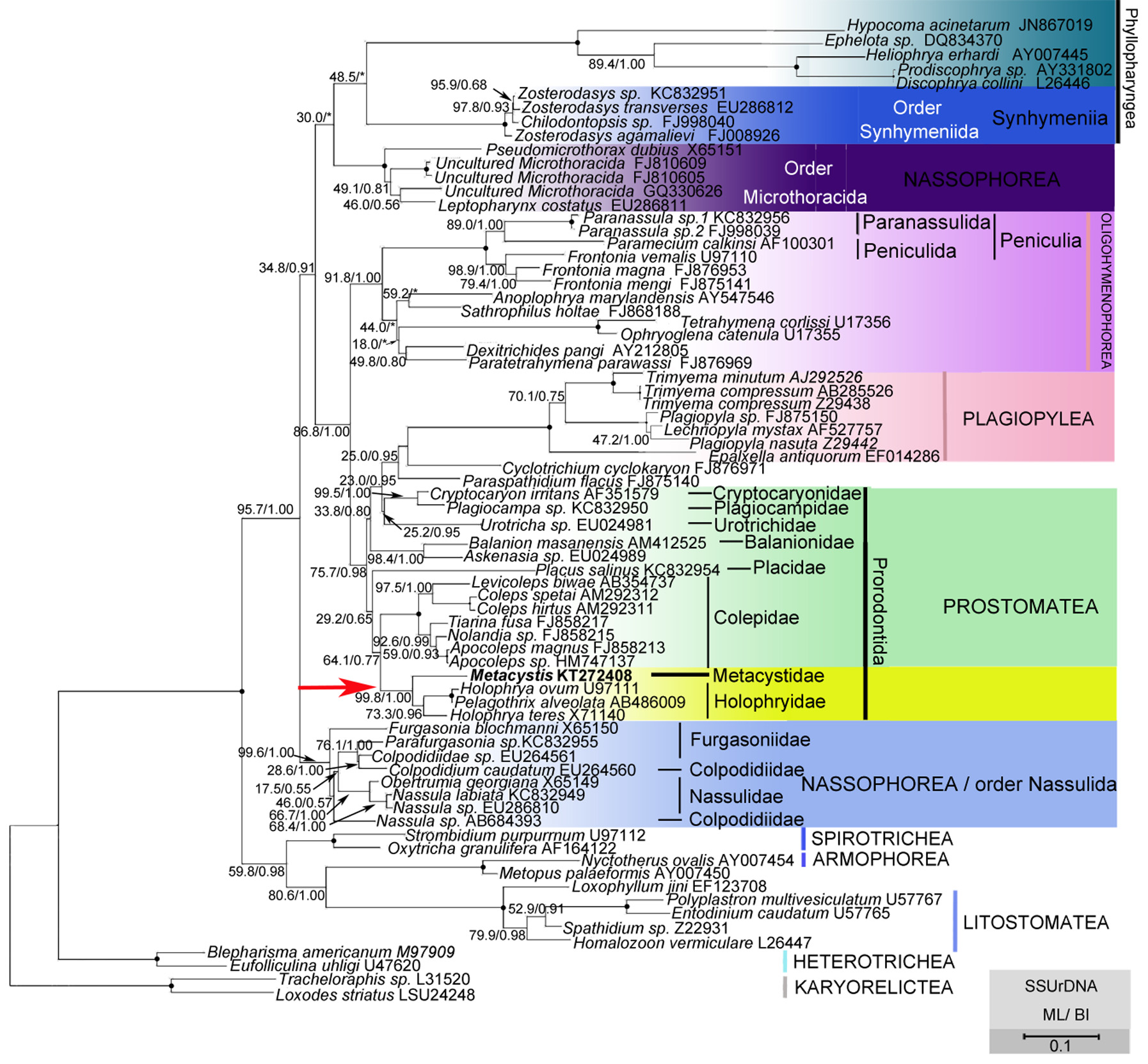FIGURE 3. Maximum-likelihood tree inferred from small subunit rRNA gene sequences. Nodal support for branches in the ML and Bayesian inference (BI) trees are marked in order. Black circles indicate full support in all analyses. All branches are drawn to scale. The scale bar corresponds to ten substitutions per 100 nucleotide positions. The newly sequenced species in this work is in bold font and marked by the red arrow.
