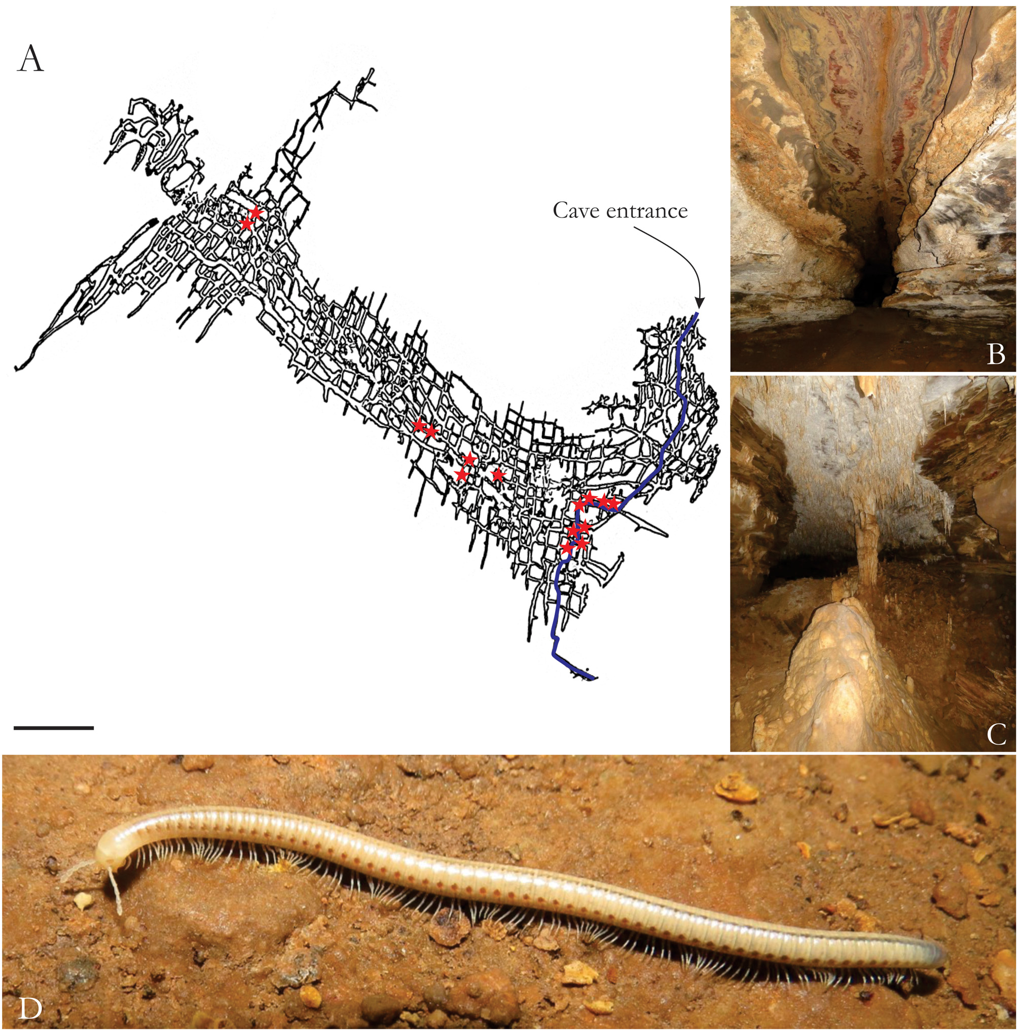 FIGURE 1. Distribution map of Pseudonannolene lundi n. sp. A) The map of Lapa Sem Fim cave, indicating with red star the specific location where the species was found and with blue line the subterranean river (credits for the cave map: Grupo Bambui de Pesquisas Espeleológicas). Scale bar corresponding to 60 meters; B) A dry conduit of the cave; C) An inner moist chamber; D) Pseudonannolene lundi n. sp., living specimen.