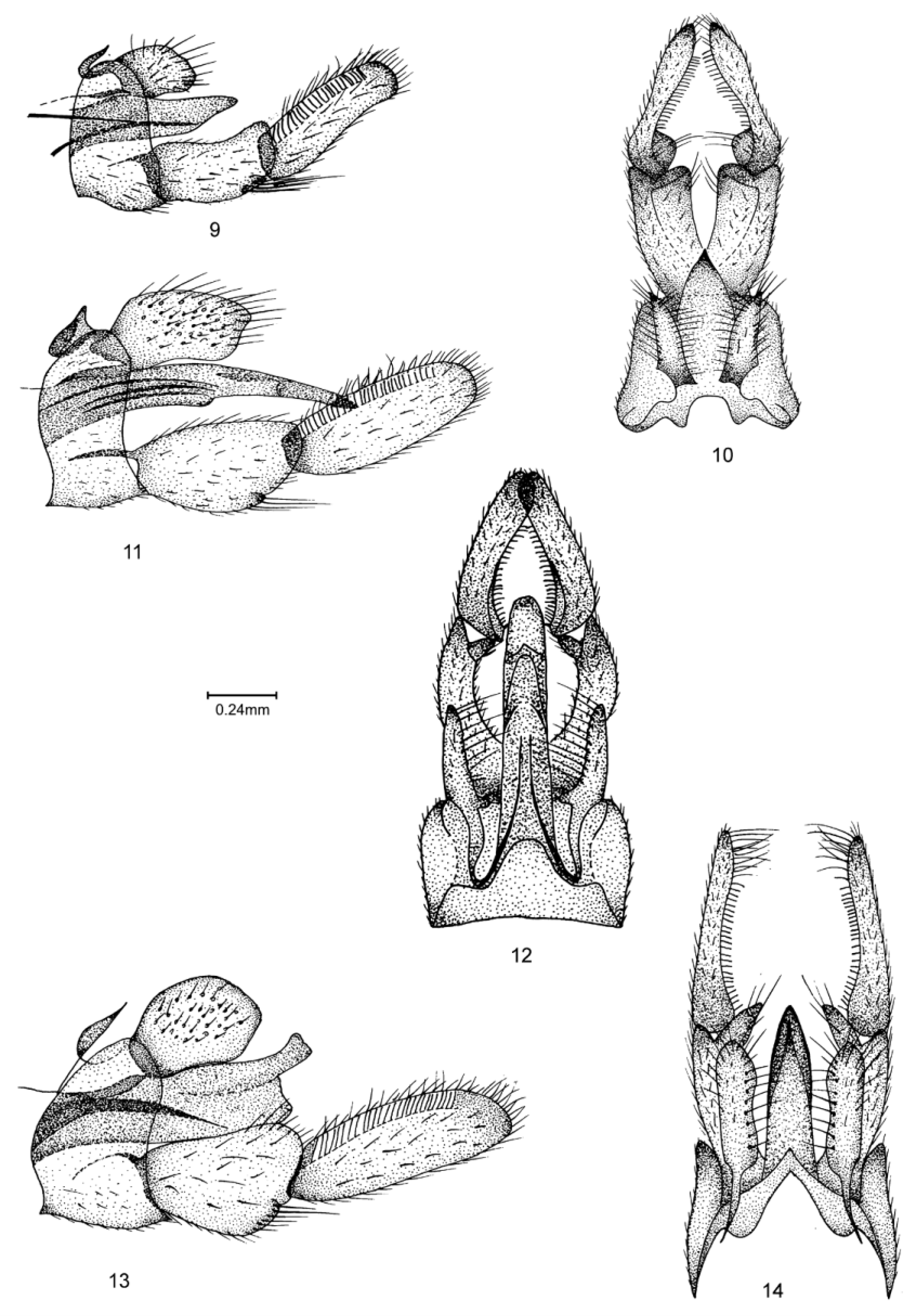 FIGURE 9–14. Kisaura spp., male genitalia. 9–10, K in Five new species of genus Kisaura Ross (Trichoptera: Philopotamidae) from Himachal Pradesh (India)