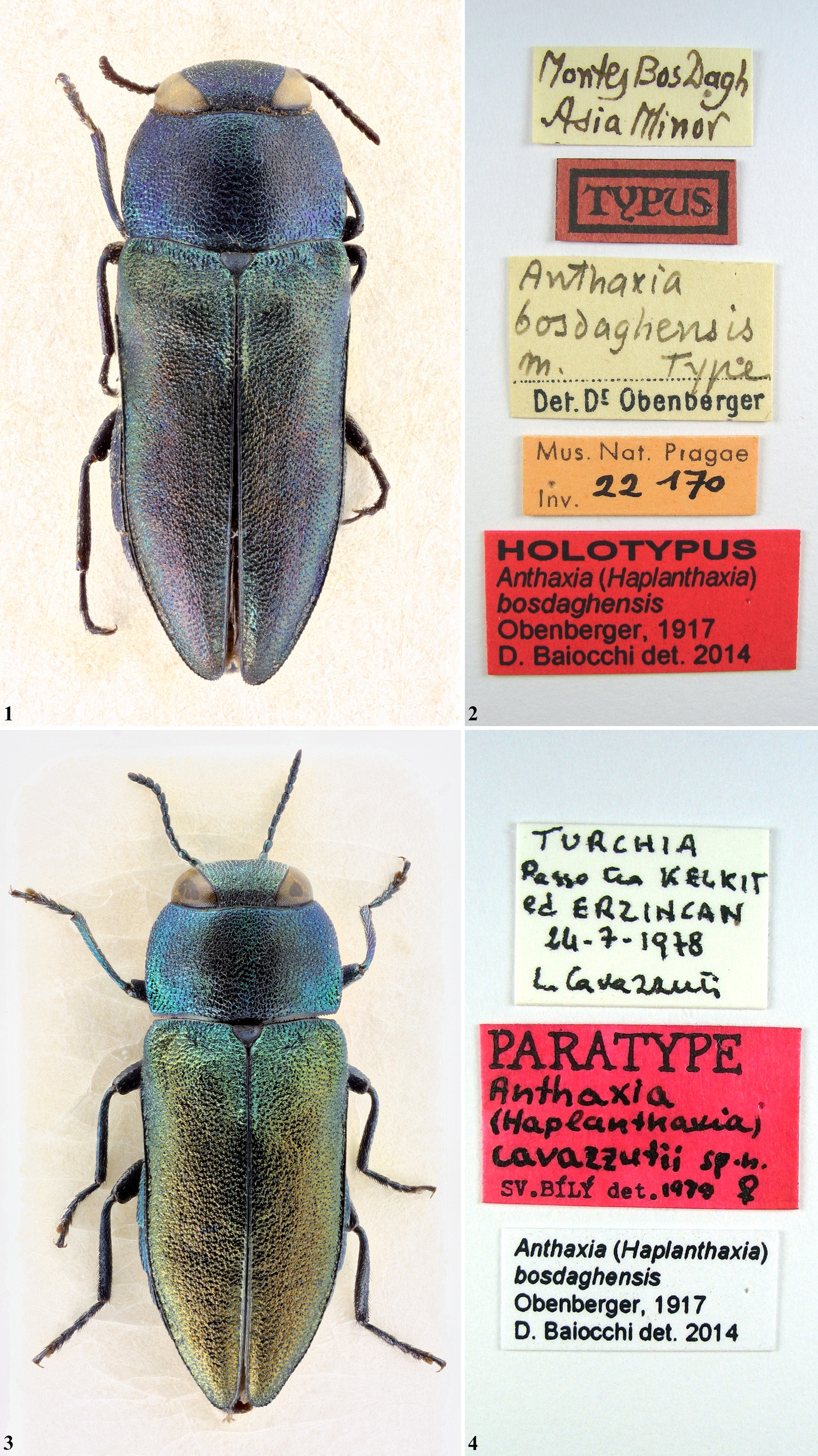 FIGURES 1–4. Fig. 1, Anthaxia (Haplanthaxia) bosdaghensis Obenberger, 1917, ♀, holotype (NMPC), dorsal aspect, 5.3 mm.; Fig. 2, the same, original labelling; Fig. 3, A. (H.) cavazzutii Bílý, 1979, ♀, paratype (MCCI), dorsal aspect, 4.8 mm.; Fig. 4, the same, original labelling.