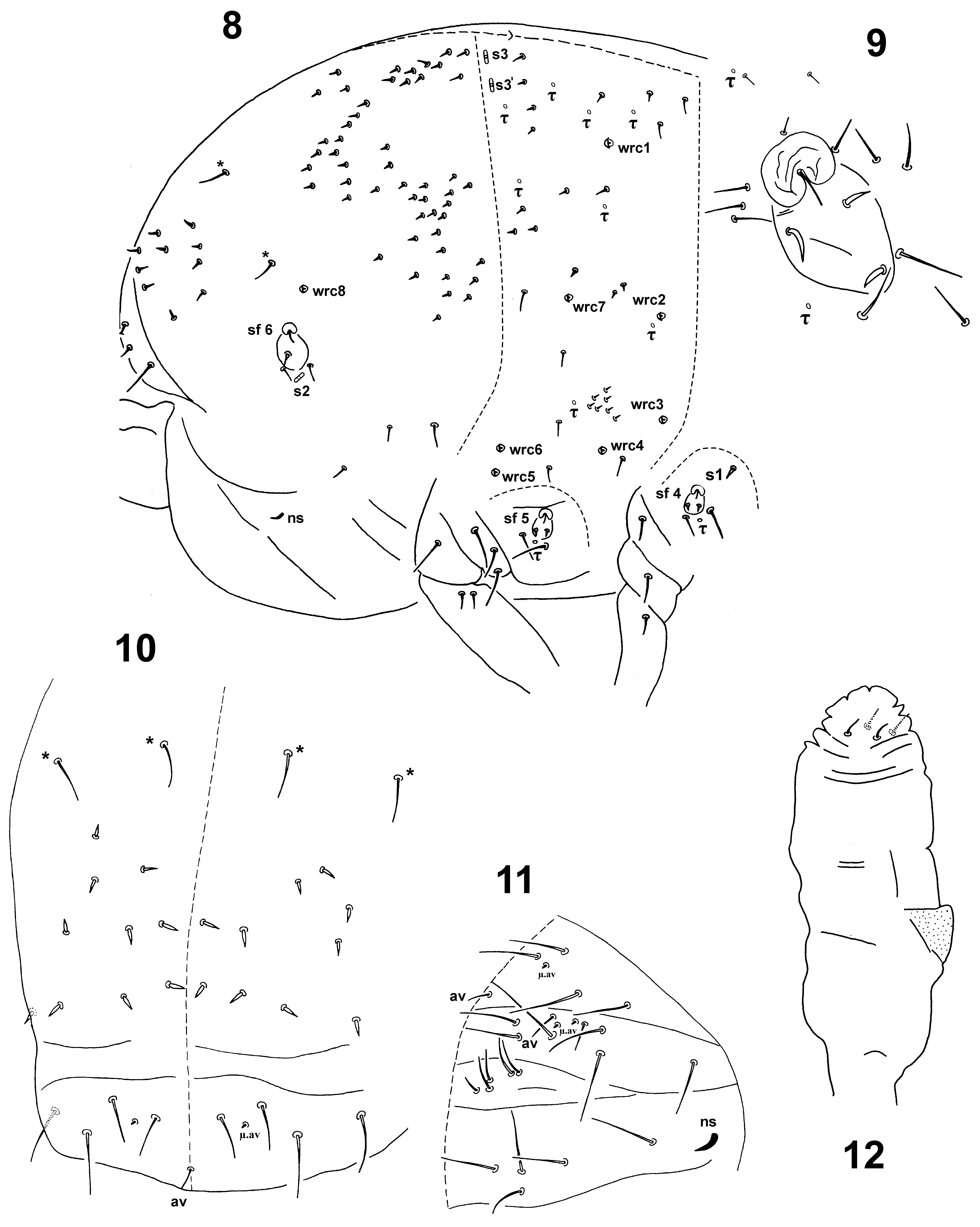 FIGURES 8–12. Neelus cvitanovici sp. nov.: 8, chaetotaxy and arrangement of sensory fields on on thorax and abdomen, specimen from Markov ponor cave, sf 4–6—sensory field 4–6, ns—neosminthuroid chaetae, τ— τ-chaetae, * indicates variability in type of chaetae; 9, thoracal sensory field with τ-chaetae and 2+2 axial chaetae above s.f.; 10, posterior part of abdomen, specimen from Markov ponor cave, av—anal valve chaetae, Μ.av—microchaetae of anal valves, * indicates variability in type of chaetae; 11, Abd. IV-VI half-sterna; 12, tubus ventralis, lateral view.
