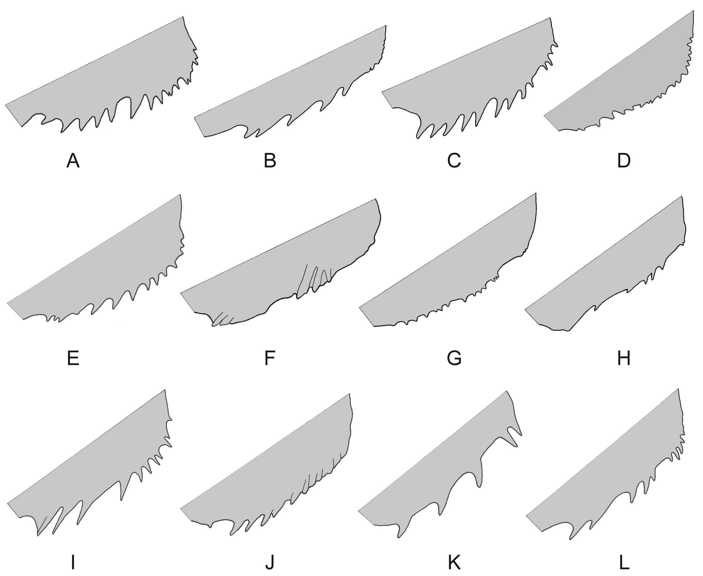 FIGURE 8. Margins of preopercle lower limb (not drawn to scale), showing relative spine development in selected species of Owstonia: A, O. contodon, USNM 438013, 162 mm SL; B, O. elongata, USNM 432454, 110 mm SL; C, O. geminata, ASIZP 68128, 79 mm SL; D, O. maccullochi, holotype (right side reversed), AMS IA.5815, 156 mm SL; E, O. maccullochi, NTM S.11765−001, 146 mm SL; F, O. rhamma, holotype, MNHN 1995–0005, 102 mm SL; G, O. sarmiento, ANSP 165126, 82 mm SL; H., O. scottensis, CSIRO H.7136−04, 103 mm SL; I, O. sibogae, ANSP 152035, 113 mm SL; J, O. taeniosoma, CAS 133928, 126 mm SL; K, O. tosaensis, ANSP 153169, 100 mm SL; L, O. weberi, ZMUC P.531552, 127 mm SL.