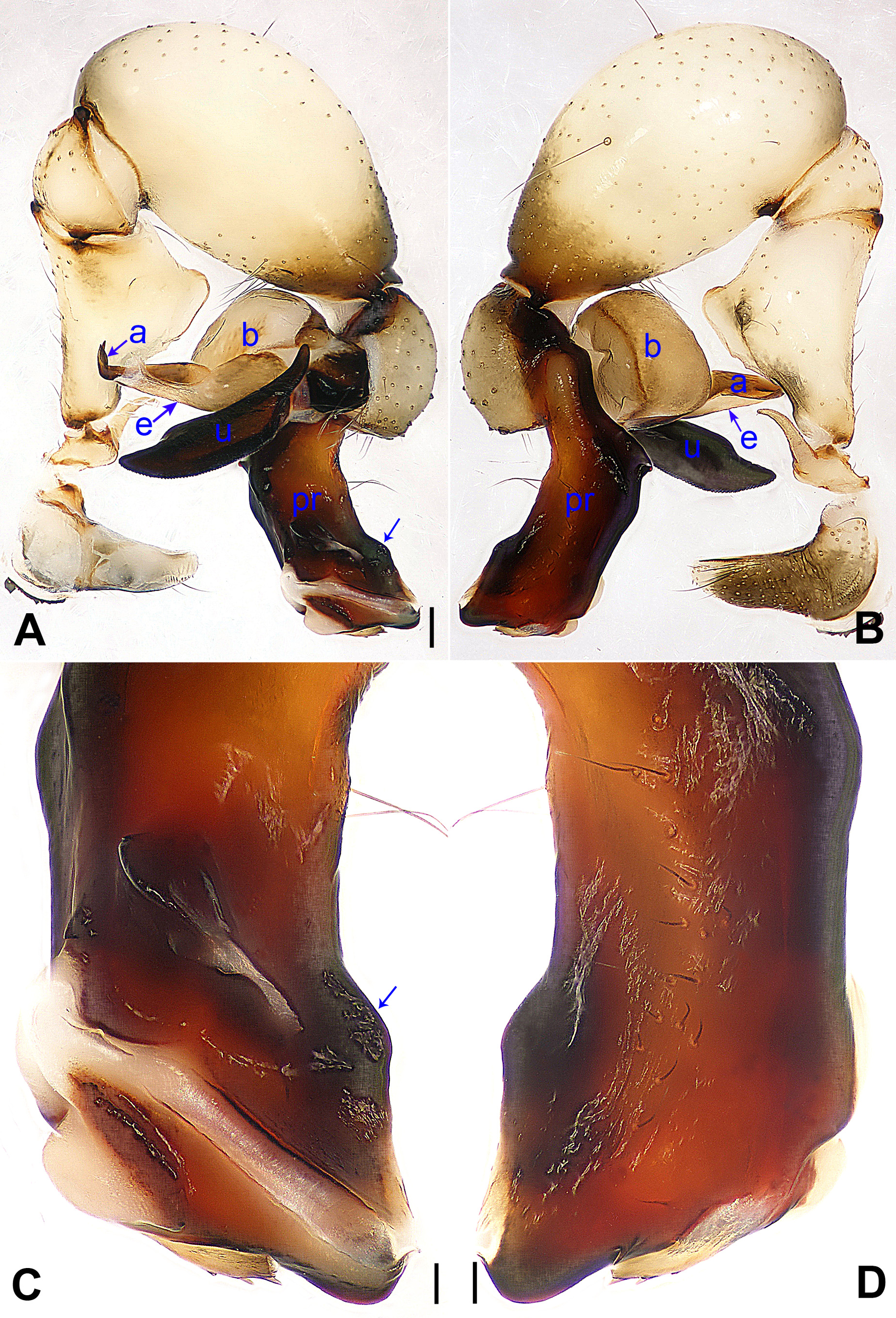 FIGURE 9. Pholcus krachensis sp. nov., holotype male. A–B. Pedipalp (A. Prolateral view, arrow points at indistinct dorsal apophysis subdistally on procursus; B. Retrolateral view); C–D. Distal part of procursus (C. Prolateral view, arrow points at indistinct dorsal apophysis subdistally on procursus; D. Retrolateral view). a = appendix, b = bulb, e = embolus, pr = procursus, u = uncus. Scale bars: 0.15 (A–B), 0.05 (C–D).