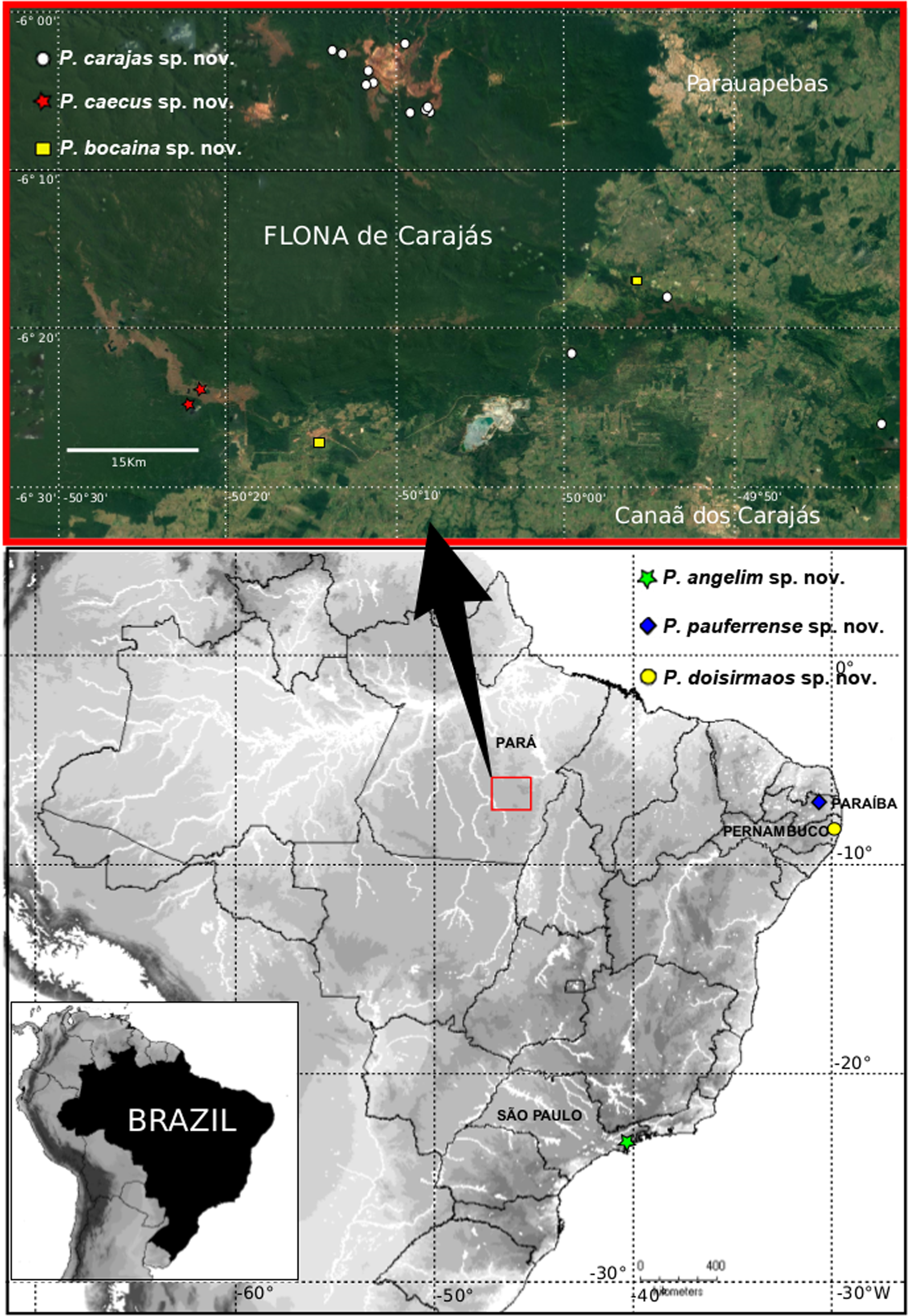 FIGURES 75. Known distribution records of species of Paracymbiomma gen. nov. from Brazil. In detail the distribution of caves species in Pará state.