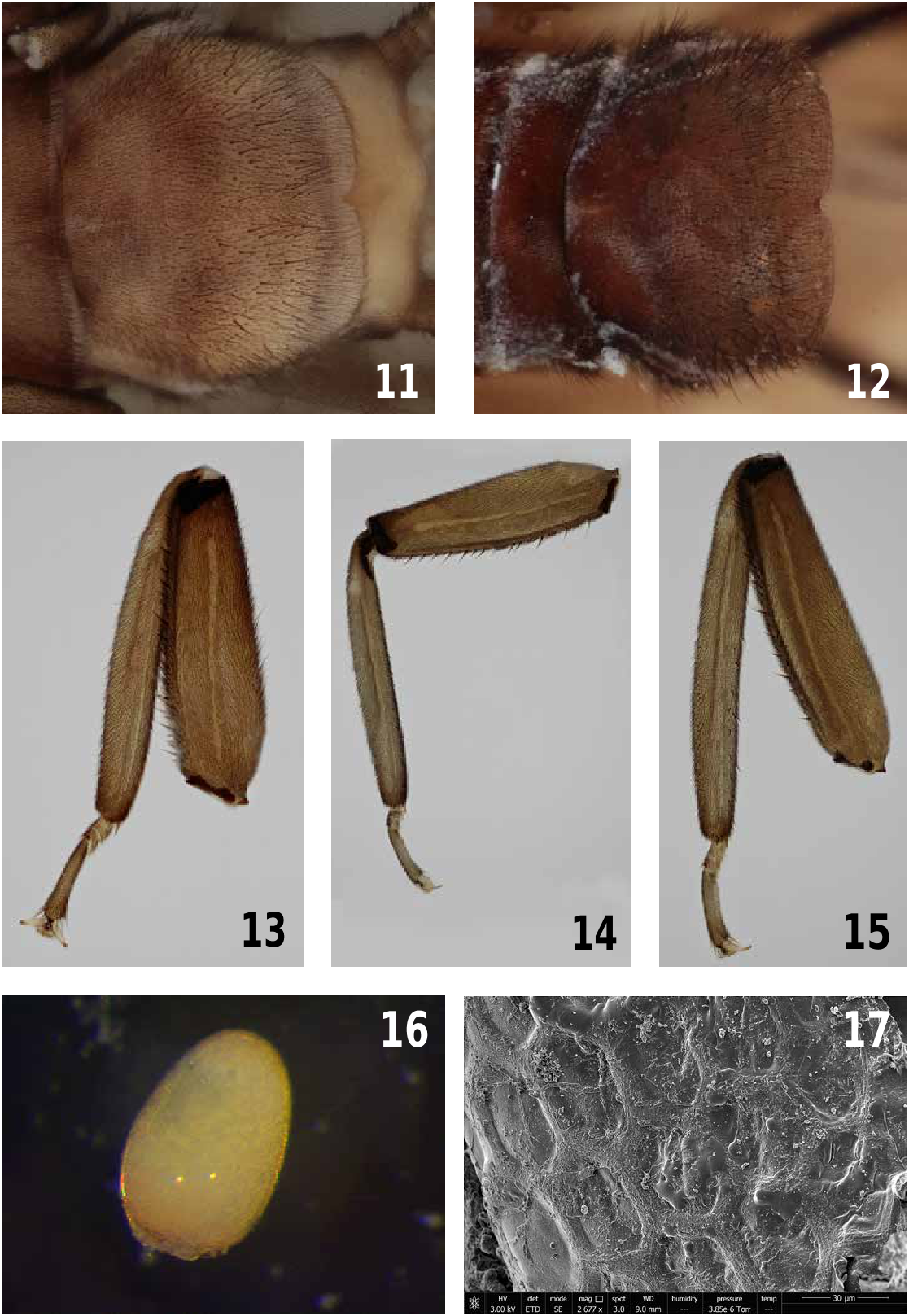 FIGURES 11–17. 11–15, a putative female of E. preclara. 11–12, subgenital plate; 11, a female from Acopán-tepui, 12, a female from Kukenán-tepui; 13–15, legs; 13, foreleg; 14 middle leg; 15, hind leg. 16–17, egg photographs; 16, a photograph from a binocular microscope; 17, egg chorion detail from a scanning microscope.