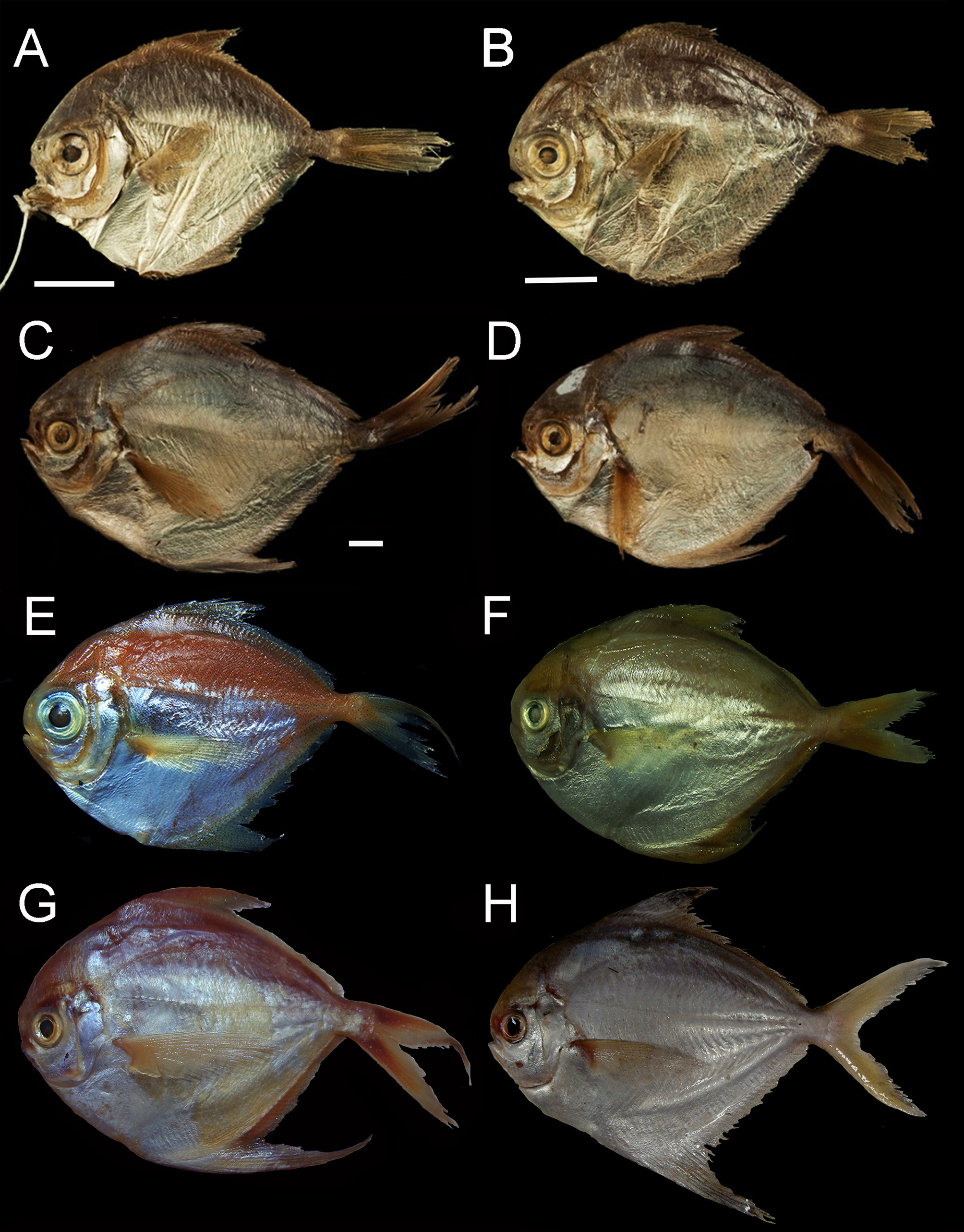 FIGURE 1. Body of Peprilus crenulatus in lateral view. A. Syntype of P. crenulatus MNHN 6828. Cayenne. B. Syntype of Rhombus orbicularis MNHN 4306 Cayenne. French Guiana. C−D. Syntypes of Rhombus argentipinnis MNHN 4061. Montevideo. Uruguay. E. Juvenile MZUSP 67688. 56 mm SL. Espírito Santo. F. Juvenile MPEG apm 1182. 86 mm SL. Pará. G. Adult MNH-UFAL 1134. 116 mm SL. Alagoas. H. Adult MPEG apm 275. 121 mm SL. Pará.