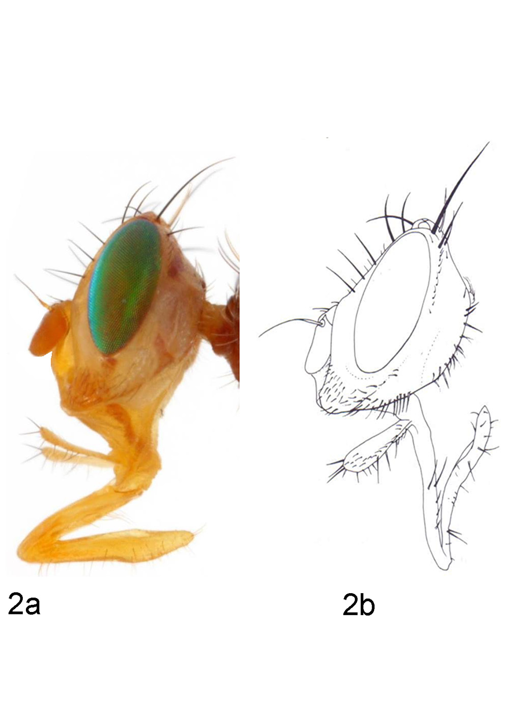 FIGURE 2. Goniglossum liat, head, lateral view. 2a. photo. 2b. drawing (drawing, reproduced by permission, from: A. Freidberg & J. Kugler, Diptera: Tephritidae (Fauna Palaestina: Insecta, IV), Jerusalem: The Israel Academy of Sciences and Humanities, 1989, fig. 201 (by Walter Ferguson), p. 190 © The Israel Academy of Sciences and Humanities).