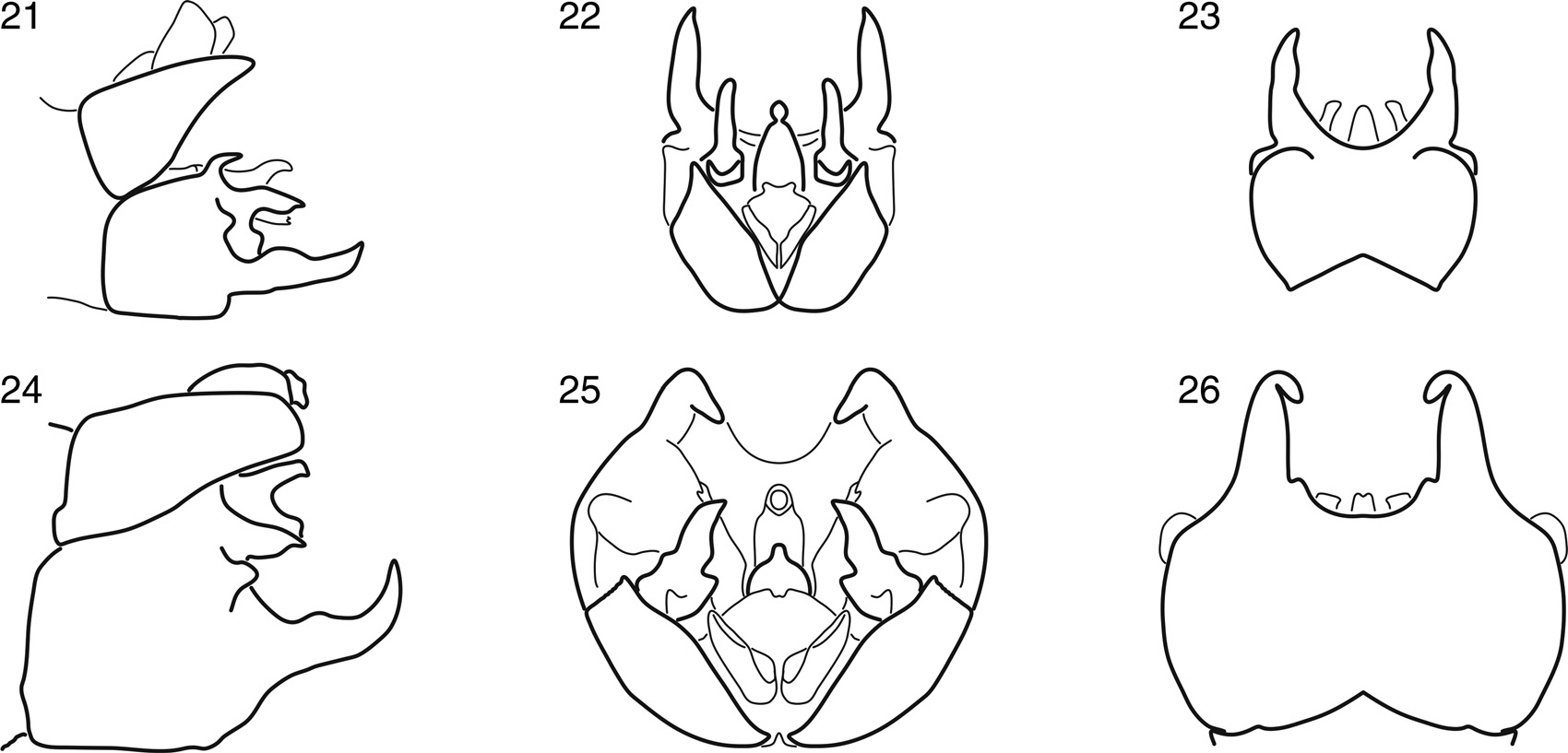 Figs. 21–26 in Taxonomic revision of Plyomydas Wilcox & Papavero, 1971 with the description of two new species and its transfer to Mydinae (Insecta: Diptera: Mydidae)