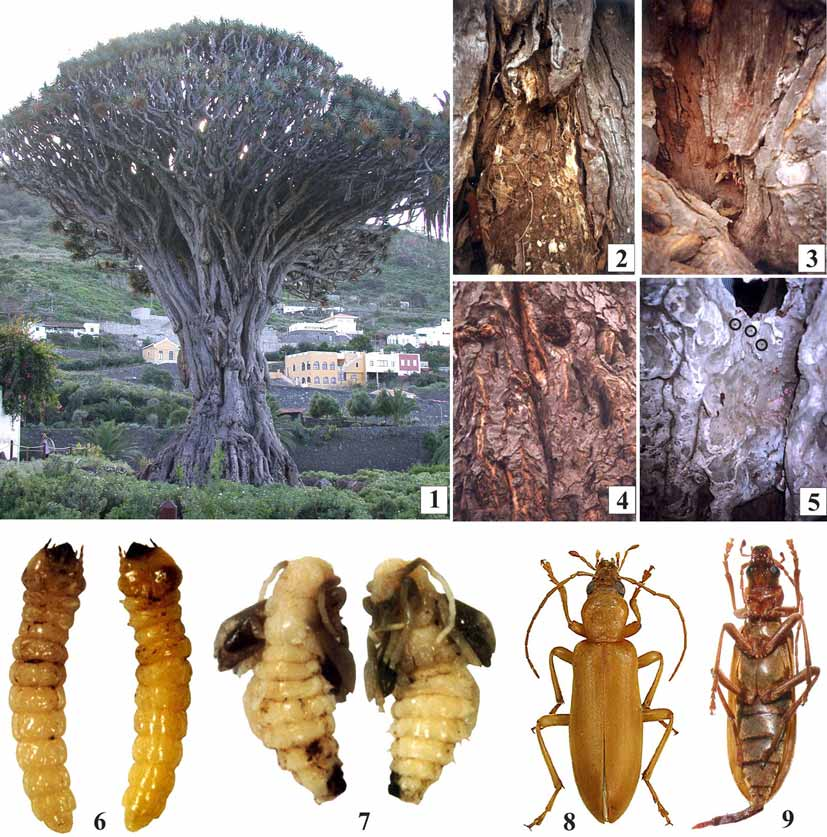 FIGURES 1–9. Dracaena draco, dragon-tree: 1, "old-age" specimen at Icod de los Vinos; 2, partial view of inner cavity, from where the first affected sample was extracted; 3, partial view of the southern face of the same cavity where larvae and pupae where obtained; 4, upper part of the cavity entrance, where larvae, pupae and adults were collected. Nacerdochroa concolor: 5, ventral and dorsal view of the larva; 7, dorsal and ventral view of the pupa; 8, dorsal view of male; 9, ventral view of female, ovipositor extended.