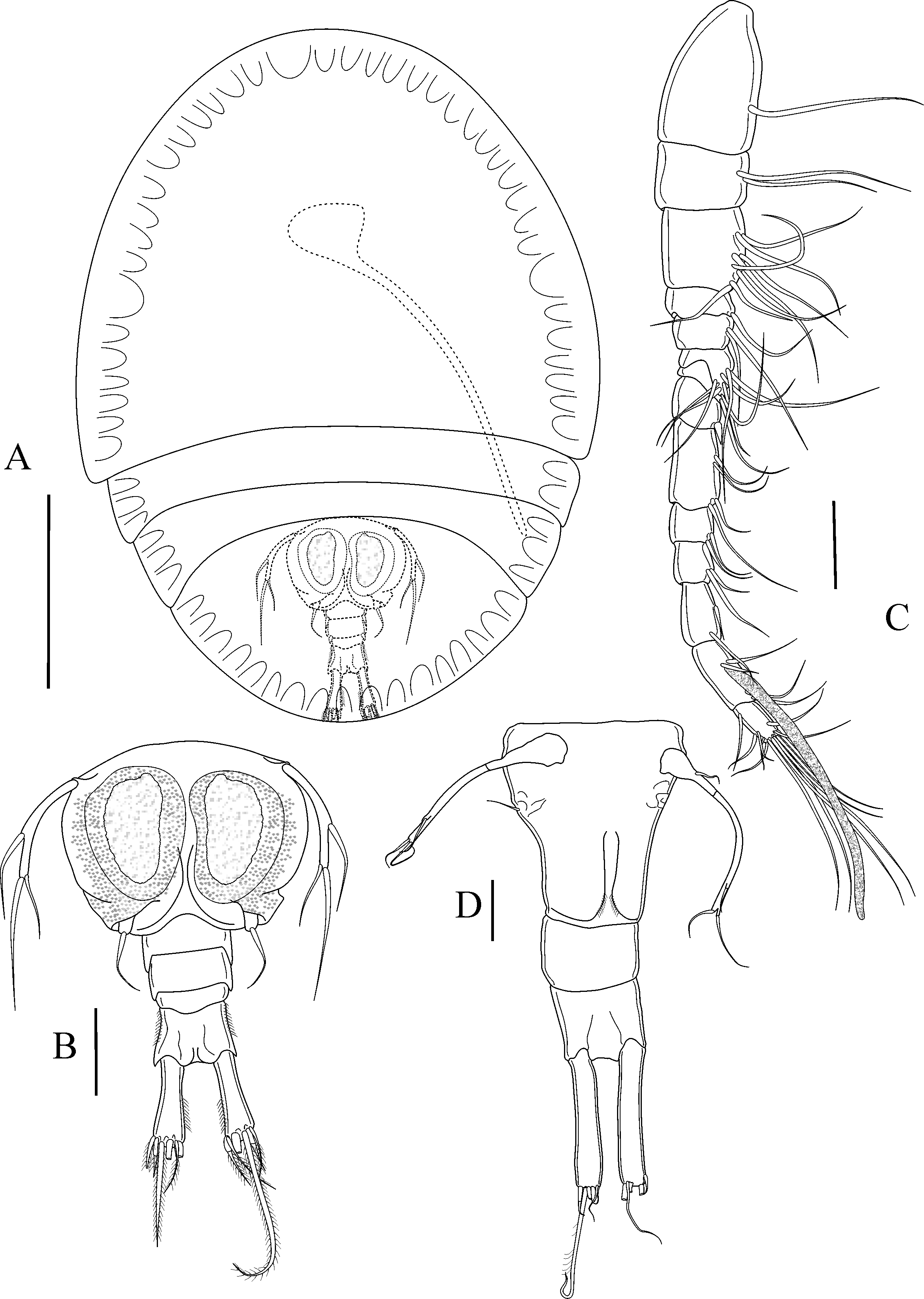 FIGURE 3. Spongiopsyllus sp. nov., male alotype (UFBA 3295). A, body dorsal view; B, urosome; C, antennule; Entomopsyllus stocki Kim, 2004 (USNM 1027325). D, urosome. Scale bars: A= 200 µm, B–C = 25 µm; D = 50 µm.