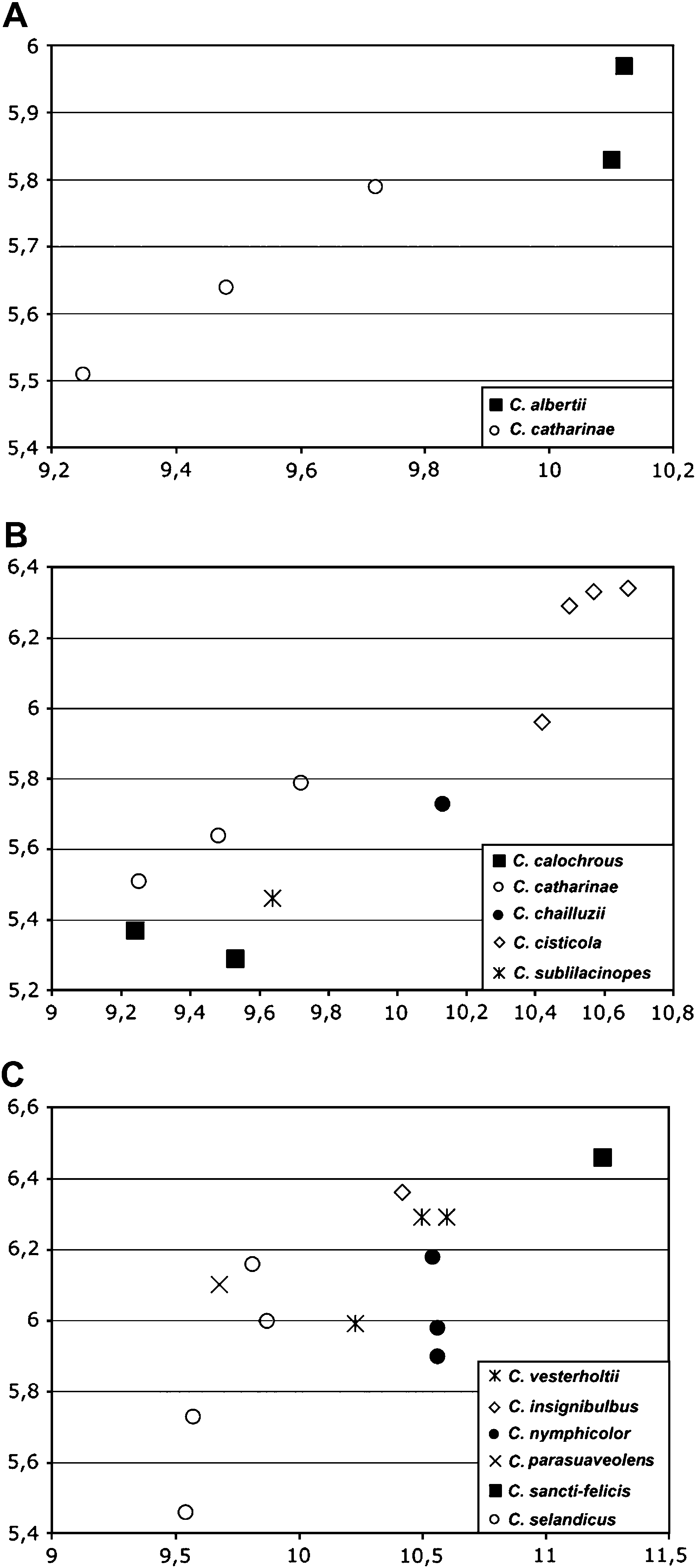 Fig 3 – Spore scatter diagrams with each point representing average spore size of single collections. (A) Cortinarius albertii and C. catharinae (B) C. calochrous, C. catharinae, C. chailluzii, C. cisticola and C. sublilacinopes. (C) C. vesterholtii, C. insignibulbus, C. nymphicolor, C. parasuaveolens, C. sanctifelicis and C. selandicus.