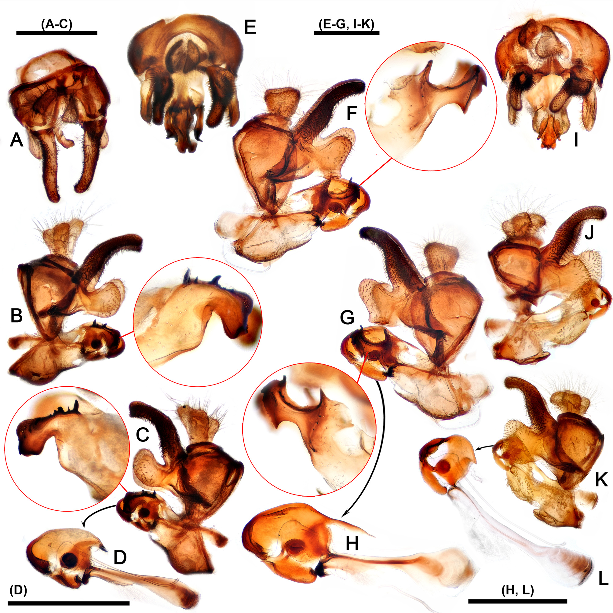FIGURE 12. Male genitalia of Xylota species, A, E, I dorsal view, B, F, J left lateral view, C, G, K right lateral view, D, H, L aedeagus lateral view: (A–D) Xylota tarda; (E–H) X. umbrosa; (I–L) X. xanthotarsis sp. n. Scale bar: 0.5mm. Enlargement showing apical part of superior lobe (lateral arms of theca).