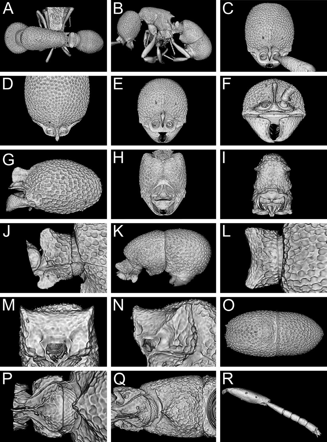 Fig. 44. Still images from shaded surface display volume renderings of D. michelae sp. n. holotype (CASENT0235469) showing virtually segmented body parts. (A) Body in dorsal view, (B) body in profile, (C) head in full-face view, (D) head in dorsal view, (E) head in anterodorsal view, (F) head in anterior view, (G) head in profile, (H) head in ventral view, (I) posterior propodeum in posterior view, (J) petiole in profile, (K) petiole and gaster in profile, (L) petiole in dorsal view, (M) petiole in anterior view, (N) petiole oblique anterior view, (O) gaster in dorsal view, (P) petiole in ventral view, (Q) abdominal sternite 3 in ventral view, (R) mesotibia and mesotarsus in anterior view.