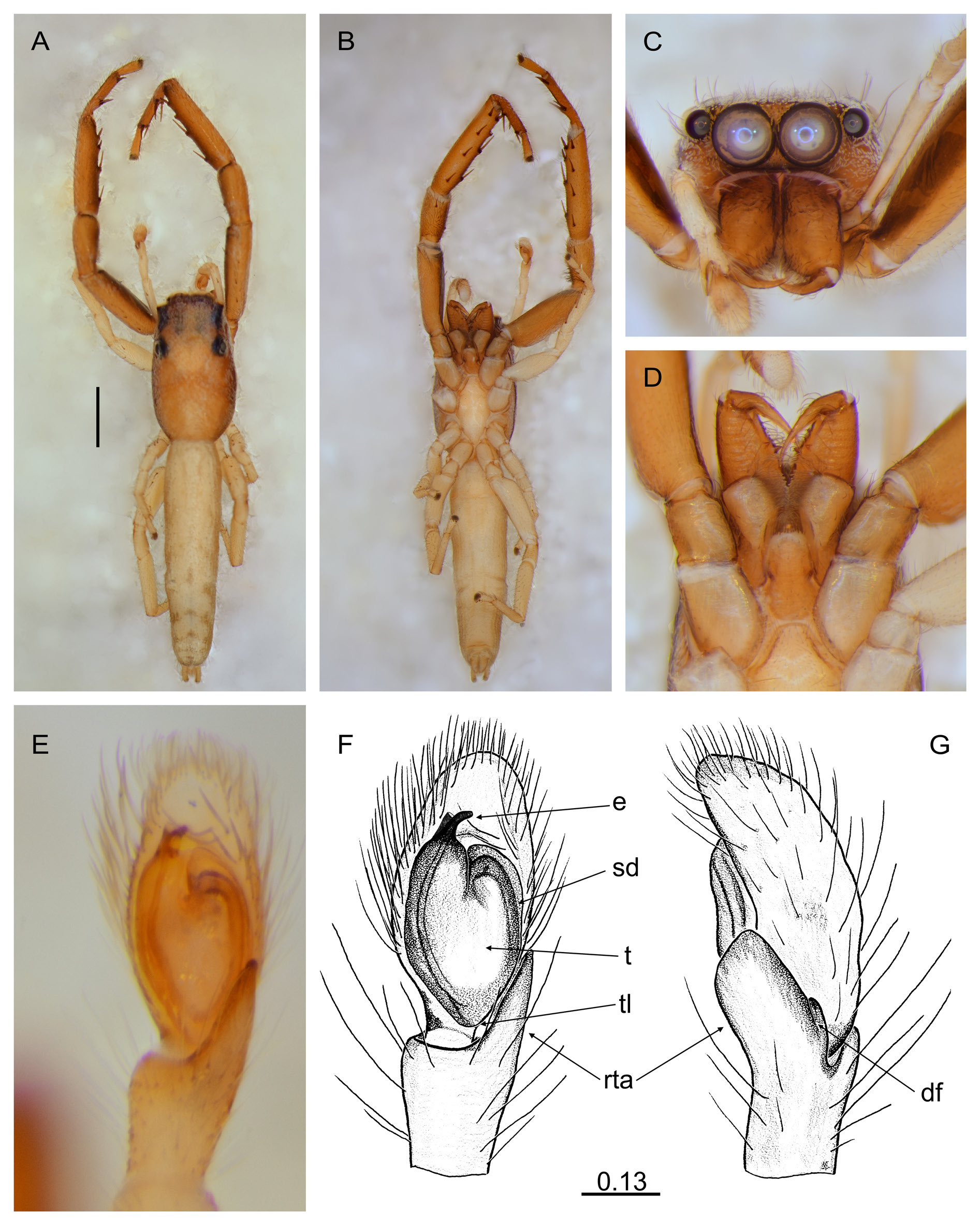 Fig. 4. Corambis jacknicholsoni sp. nov., holotype, ♂ (MNHN). A–C. Dorsal, ventral and frontal views. D. Chelicerae, maxillae and labium. E–G. Palpal organ. Scale bar: A = 1 mm.