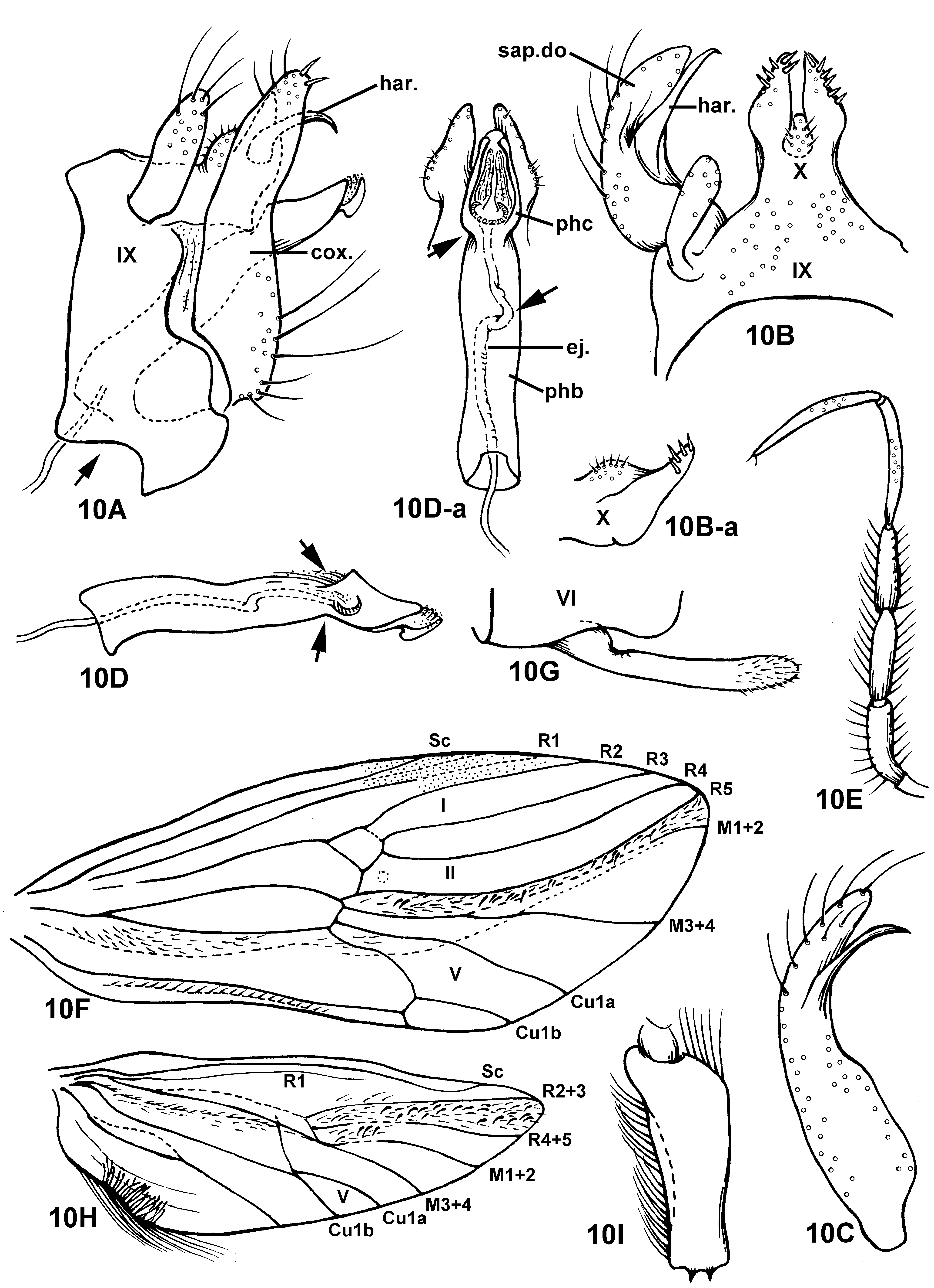 FIGURE 10. Phraepsyche acuminata Yang & Morse,, male. 10A–10D, genitalia: 10A, left lateral; 10B, right side and mesal portion, dorsal; 10B-a, apex of tergum X, left lateral; 10C, left inferior appendage, caudoventral; 10D, phallus, left lateral; 10D- a, phallus and apical triangular lobes of tergum X, ventral. 10E, Left maxillary palp, left lateral. 10F, Right forewing, dorsal. 10G, Sternum VI, left lateral. 10H, Right hind wing, dorsal. 10I, Left antennal scape, left lateral.