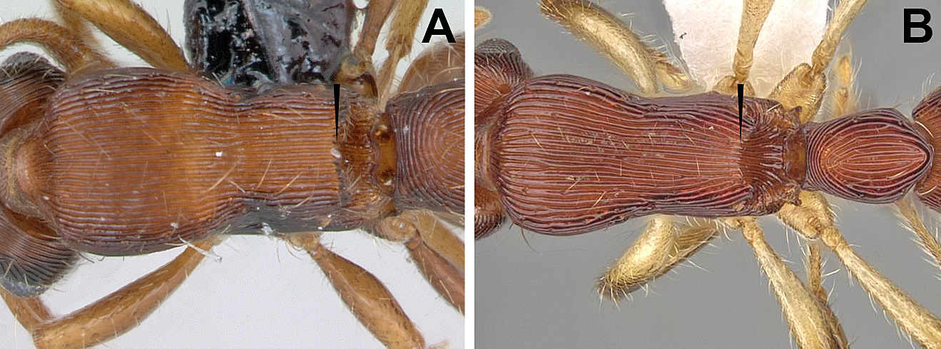 FIGURE 13. Dorsal view of mesosoma, showing: A) propodeal dorsum separated from propodeal declivity by a transverse crest (G. bruchi—CASENT0173382); and B) propodeal dorsum and declivity without crest (G. acuminata—CASENT0281511). Photos by April Nobile (A) and Zach Lieberman (B) available from www.antweb.org.