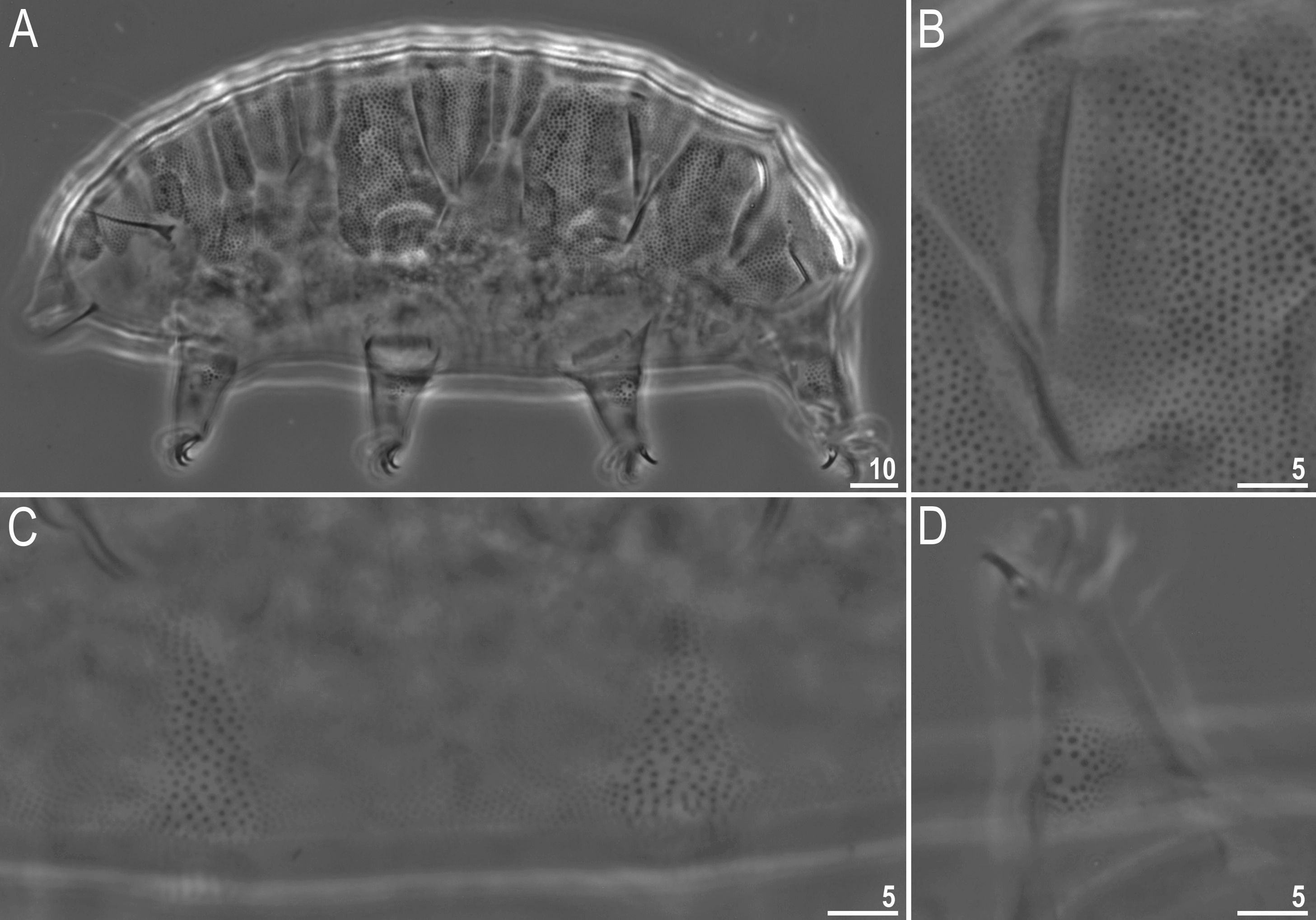 FIGURE 9. Pseudechiniscus angelusalas sp. nov., male—A—lateral view of the entire animal; (paratype, PCM); B—focus on dorsal plates with visible upper ends of cuticular pillars (paratype, PCM); C—focus on ventral patches of granulation IV and VI (paratype, PCM); D—granulation on leg III (paratype, PCM). Scale bars in micrometres [μm].